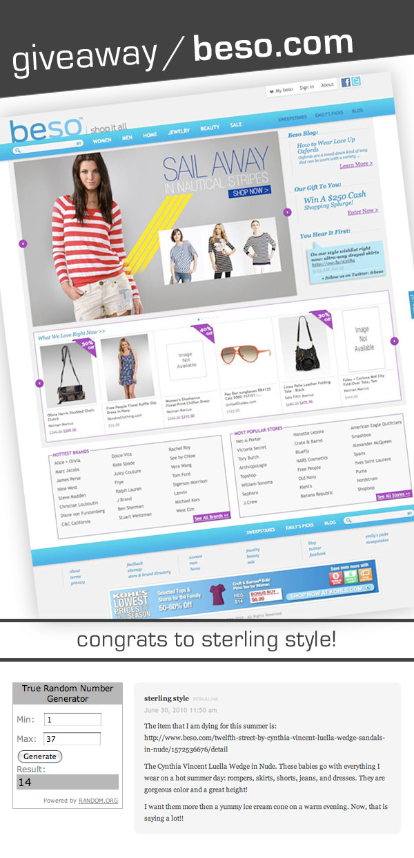 A big CONGRATS to Taylor of Sterling Style on winning my first giveaway with Beso.com. Email me to claim your prize Taylor! Thank you to everyone who took the time to participate. I hope to be doing more giveaways in the future. Thanks Beso! GOOD TIMES.