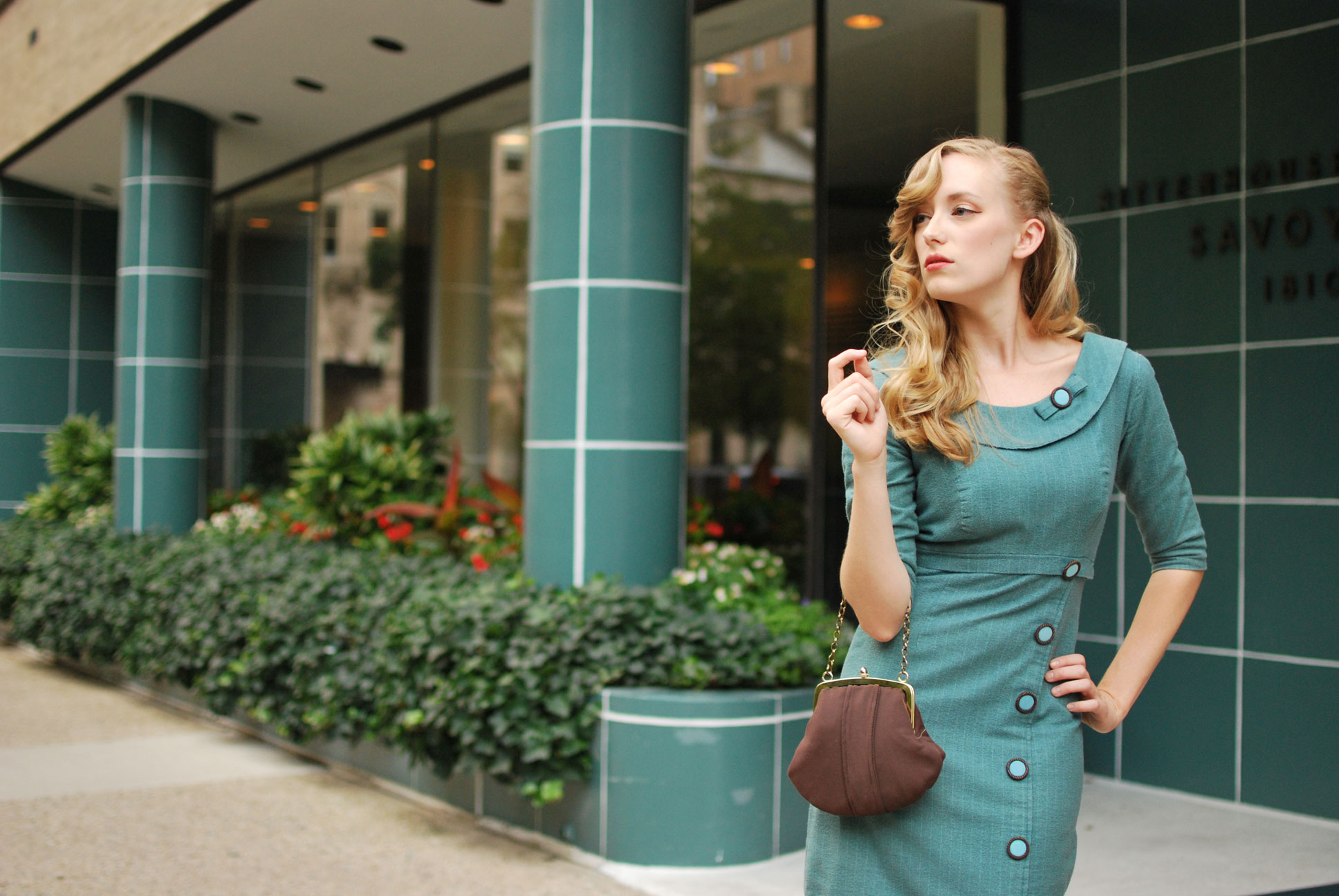 On Saturday, I slipped on my Joanie esque dress and headed out for our Mad Men Photoshoot. For those that might have missed the news, I have entered into the MAD MEN CASTING CALL and you can click to vote on my look to win! Pretty Please 😉 SO, lets start with the outfit. The Walnut Street Theater was kind of enough to take some time and gather some pieces for me which I rented. I wanted to really hit the mark. Lucky for me, this dress fit like a glove. I love the color of it and wanted to stay away from anything too dark. I put my hair in pin curls the night before, to be true to the times. Let’s just say this was my first time doing it, and I had a pretty “special” time with it. HAHAHA. I think the end product turned out just as I had envisioned. I kept my makeup to more of a daytime look. I did a slight cat eye and kept all my makeup very matte. A little cream blush, and a soft rosy red matte lipstick to polish things off. We took the photos over in Rittenhouse Square. Some of the building on the square have a bit of a retro feel and I knew this would fit in with my working girl look. I am really happy with how they turned out. What do you think of my look???