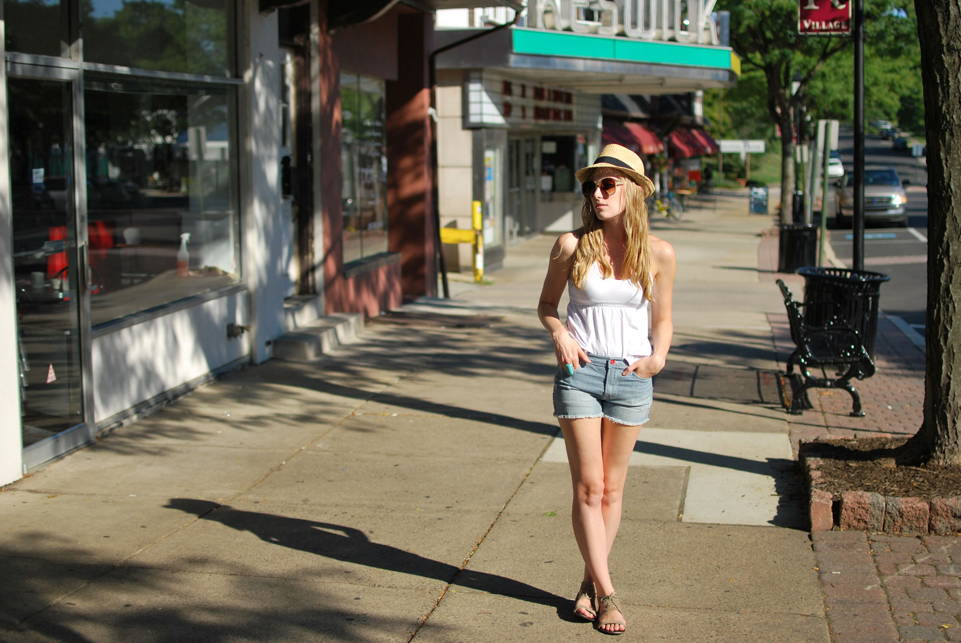 These photos are from this past weekend on an adventure to my parents house. I rarely ever wear shorts to work unless they are on the longer side so the weekend is the perfect opportunity to wear them! I got these a while back at Urban Outfitters and kind of forgot them in the bottom of my drawer. I pulled them out and sentย Andrea a quick photo to show her my dresser drawer find and she said, โI love them! AND you look like a train conductor.โ Um, so very true Andrea, so very true. So now, everytime I wear them I will think of a train conductor, Ringo, and Shining Time Station. Also, thank you to everyone who took the time to vote for me for the chictopia contest and who continue to vote for me for the Mad Men Contest. It gives me the warm and fuzzies and I thank you ๐