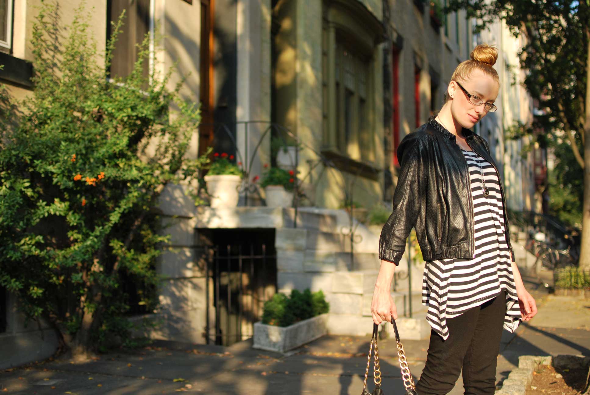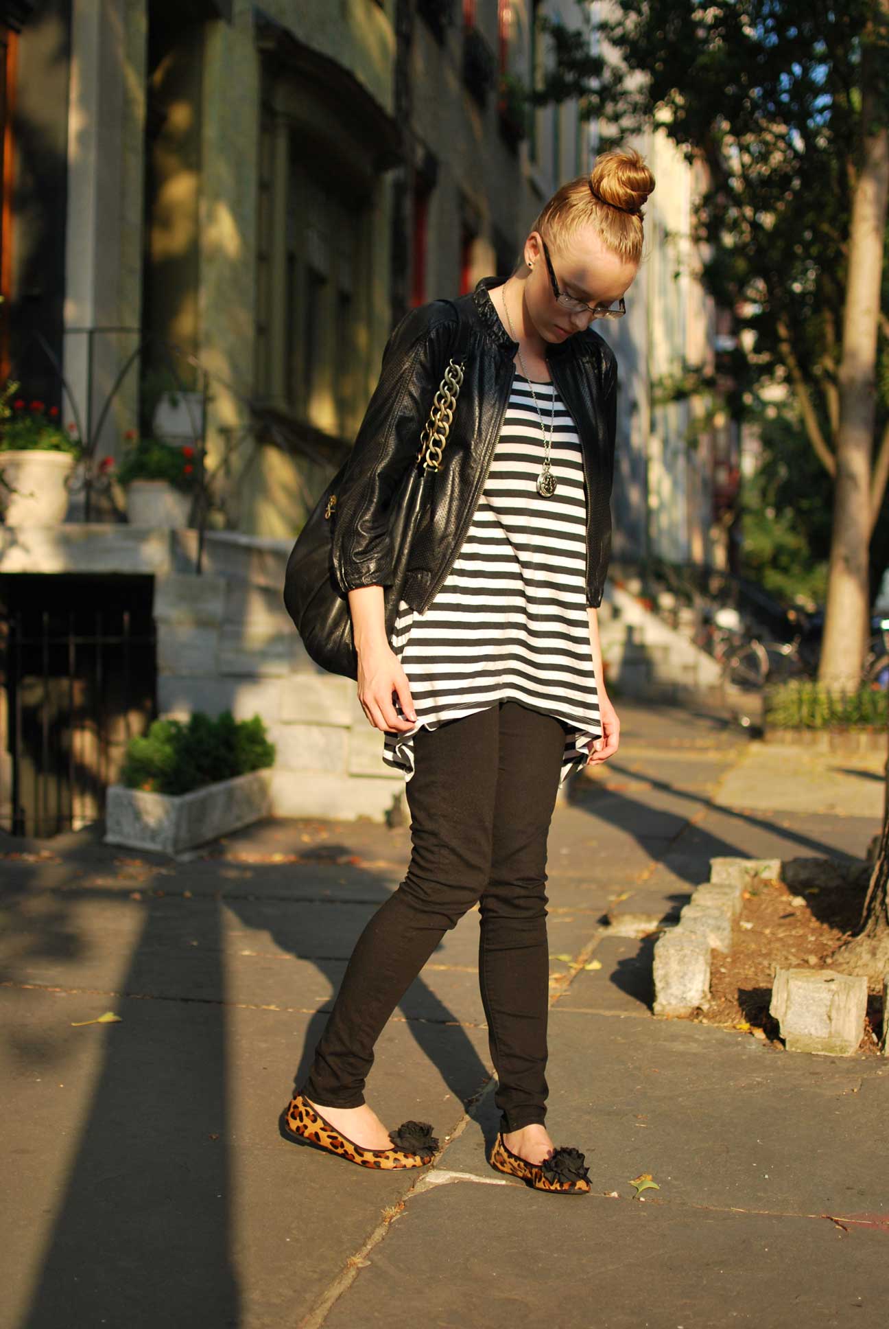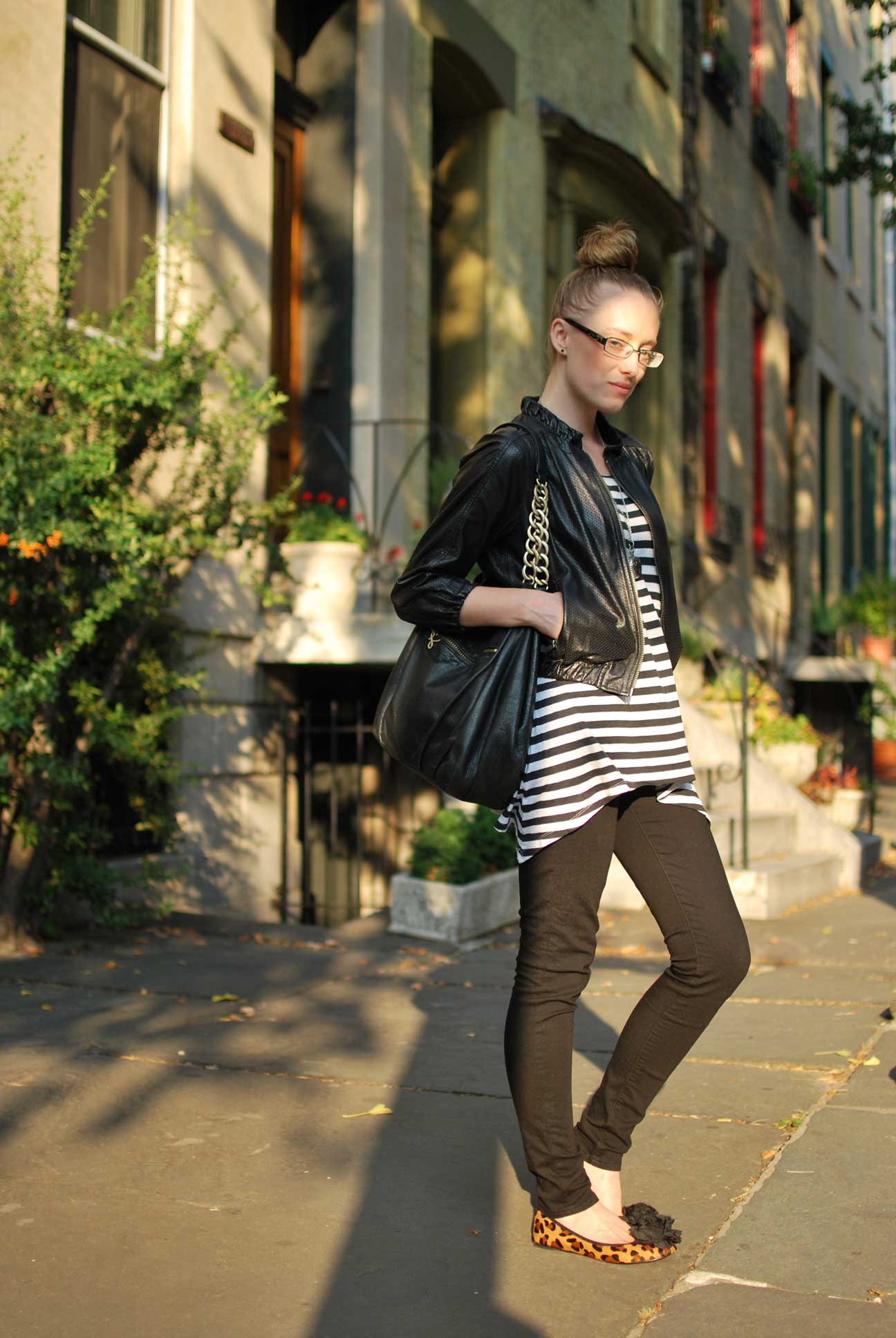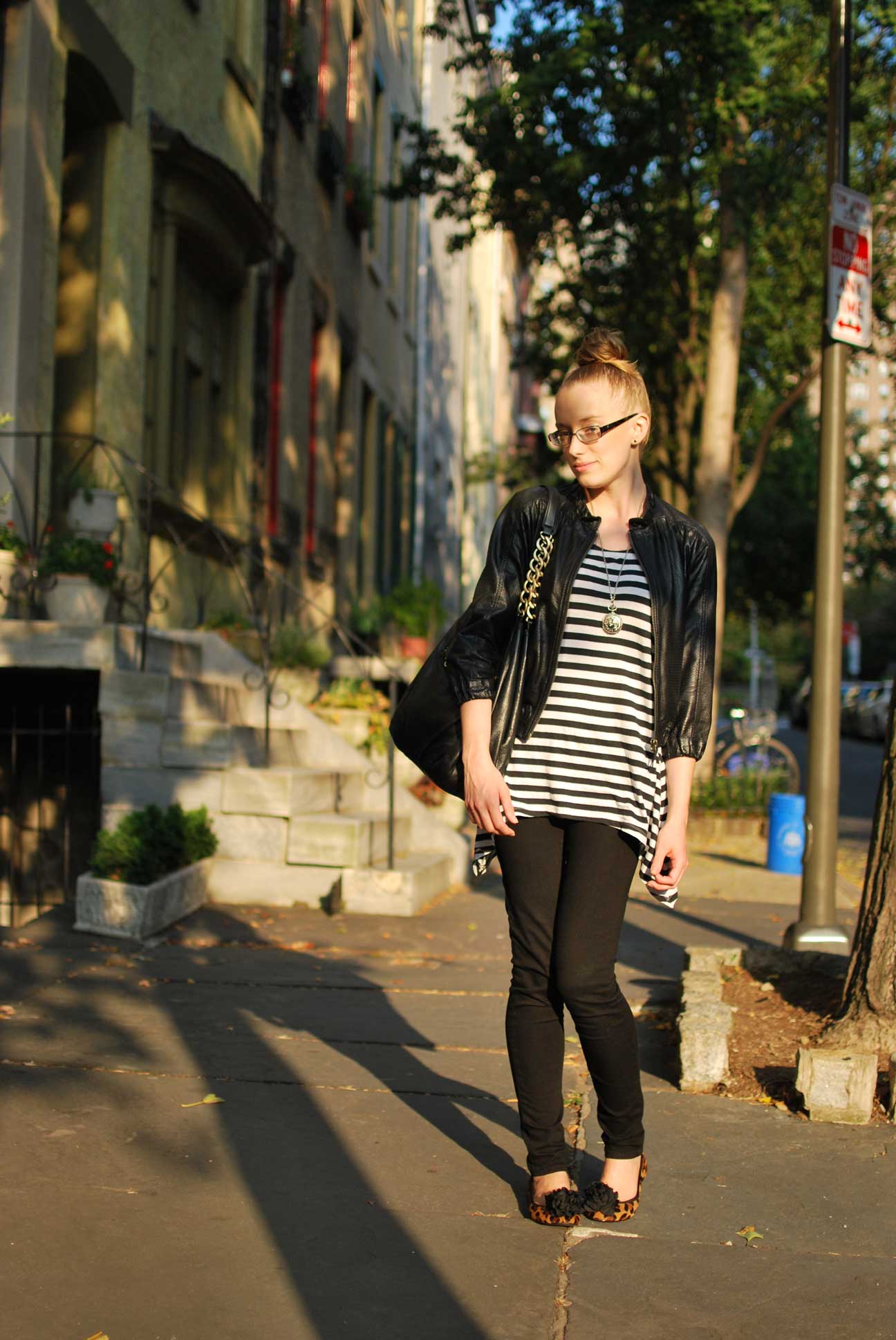 I like to call this look the pu pu platter of all my favorite things. Leather, stripes, and leopard. How can these things NOT look good together!? As you very well know from twitter, I kind of want to keep buying a million pairs of leopard flats even though I already have two. These specifically always catch me some compliments when I am out and about. I have also been inseparable with my cropped leather jacket. I feel like adding a little cropped jacket always adds something extra to a simple look. Since I have been wearing alot of black lately, I am trying to throw in patterns to spice things up.