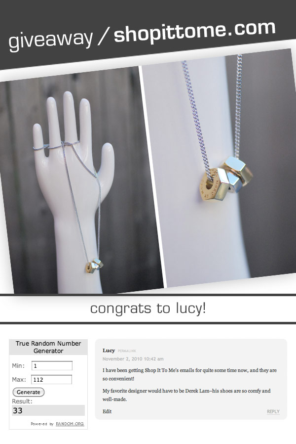 A huge congrats to lucy.r.pike@gmail.com for winning the Shop It To Me Contest!! Email me to claim your prize Lucy! Thank you to everyone who took the time to enter this contest and to Shop It To Me for sponsoring it. Iām looking forward to having lots more fun contests soon for you guys š