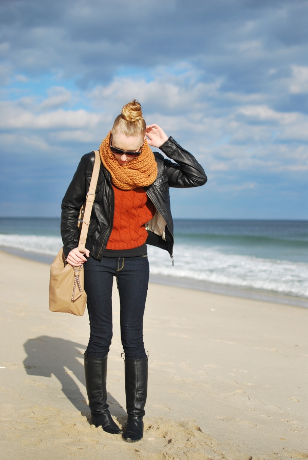 I like the sweater, and the jacket !! I think wearing boots, esp, waterproof, like faux leather boots to a beach is awesome, that way you dont get sand all over your shoes, and maybe you can even go into the water! =)