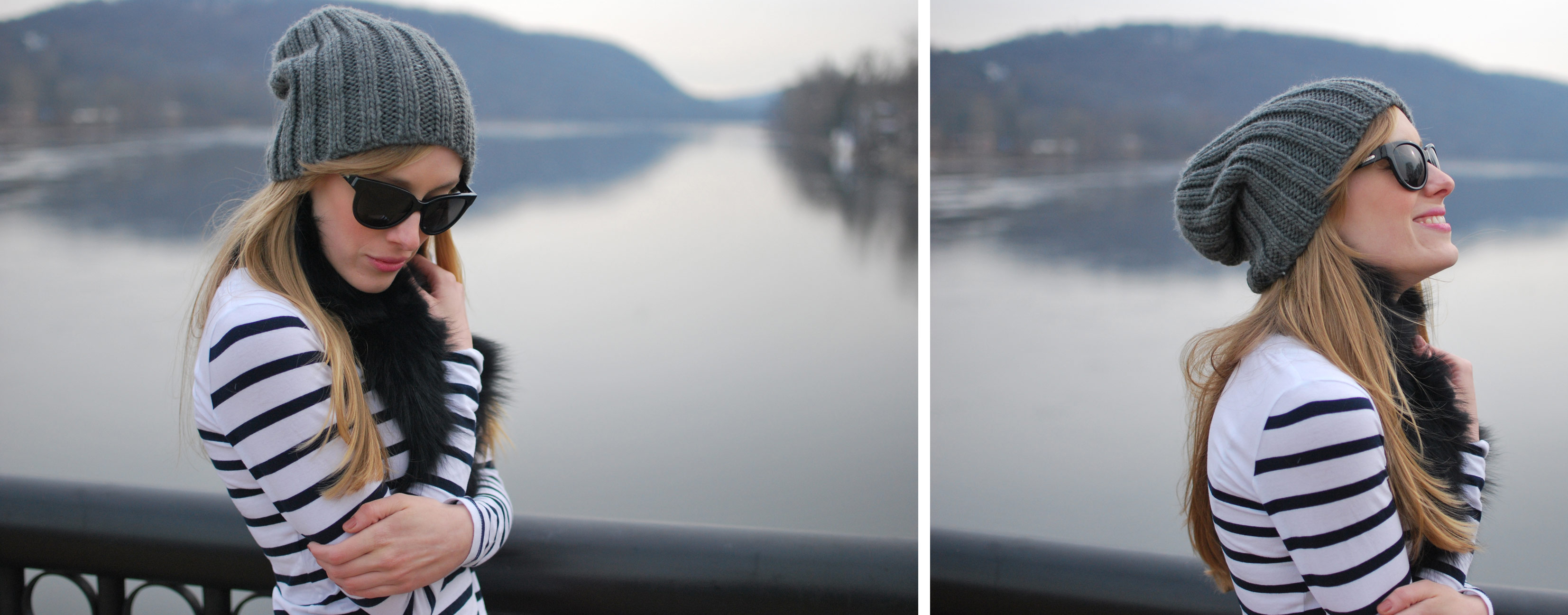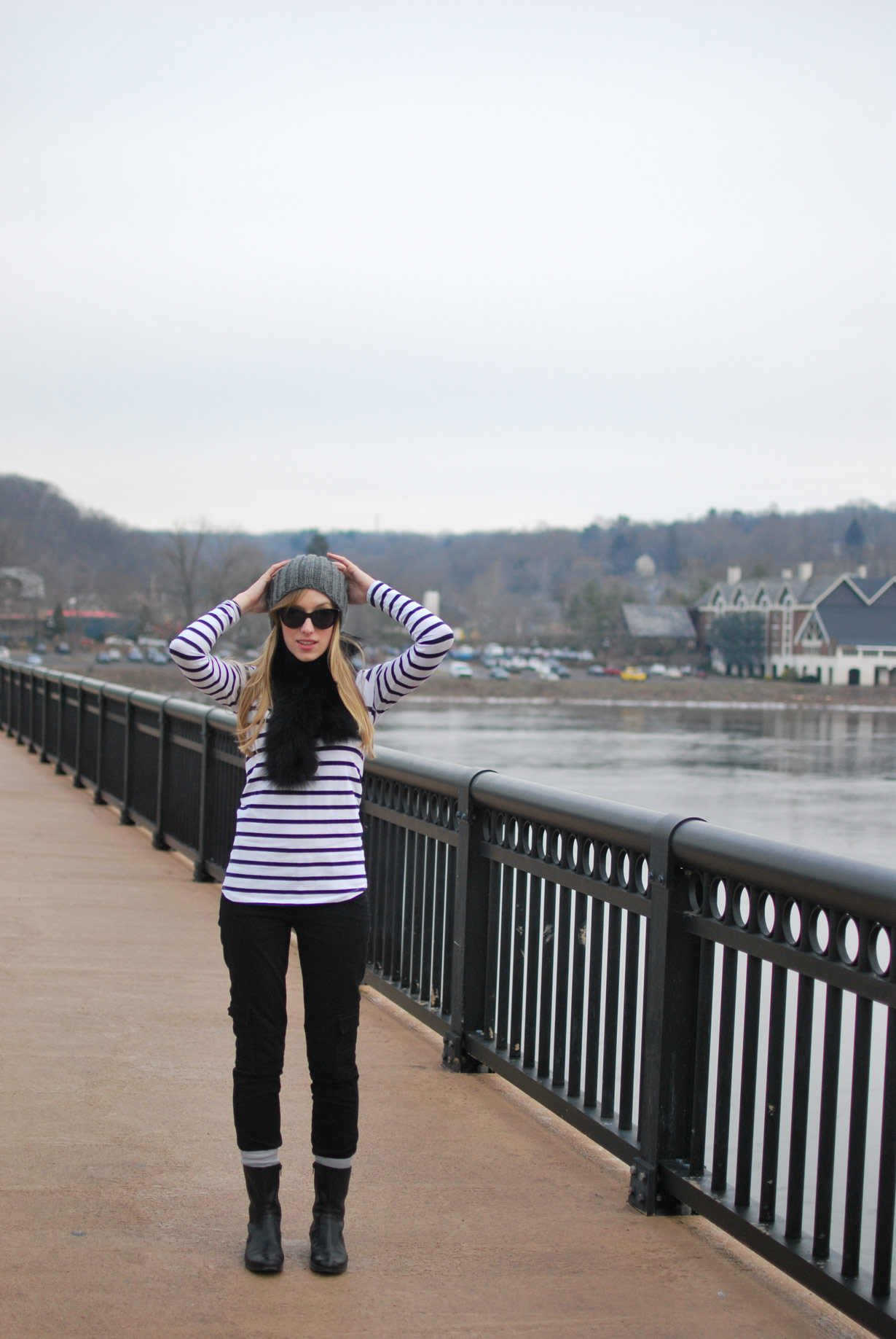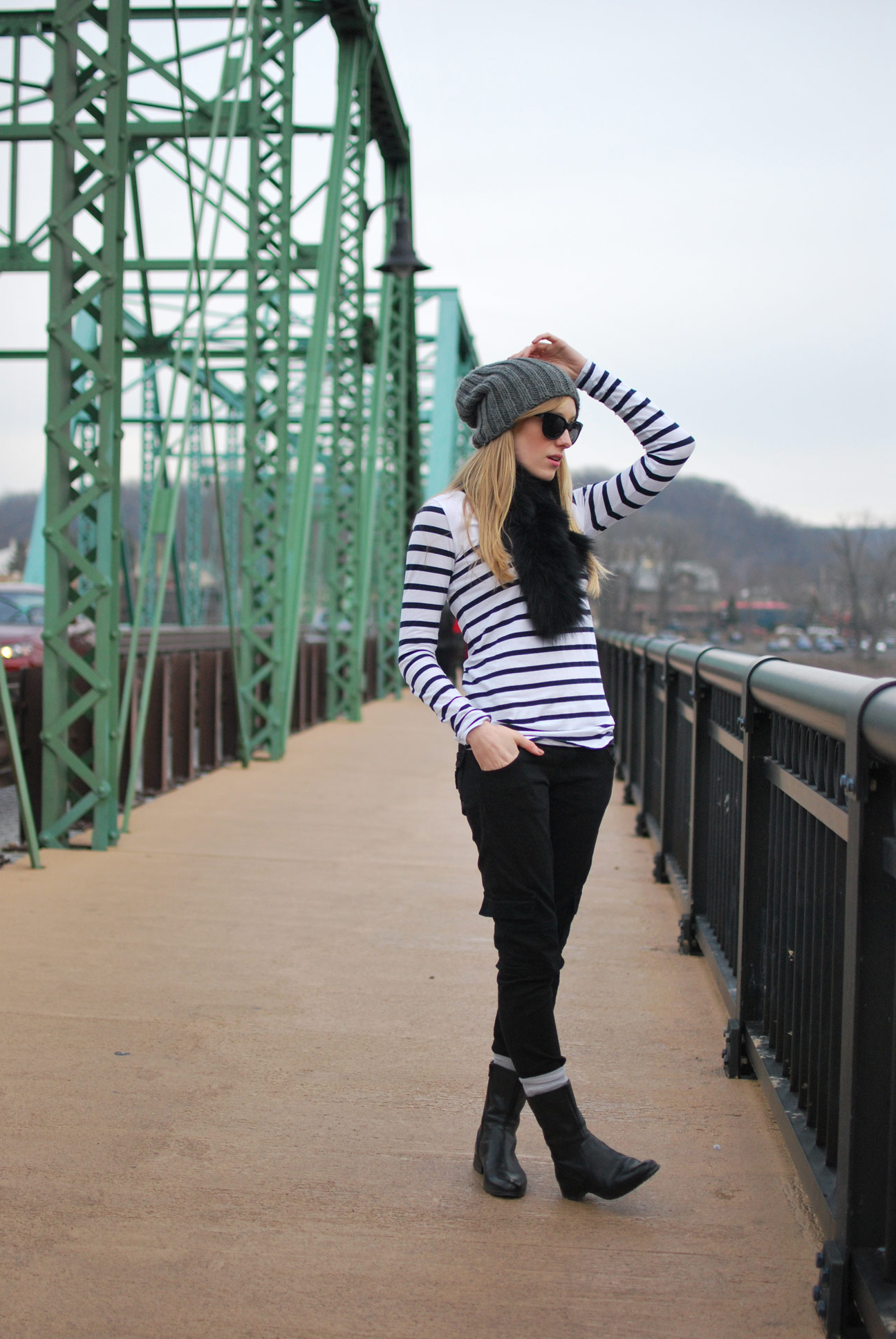 There is nothing better than little weekend trips to get out of the city and out for some fresh air. I headed to New Hope with Brian and my parents to our favorite French bakery for breakfast and a stroll. It was so so cold this day!! So I was bundled up in my big puffy coat and warm gloves. Everyone always looks at me like I’m nuts when I shed my jacket for blog photos but lets be serious, you can’t see the outfit under a heavy coat! (I know you appreciate this 😉 ) I will never turn down anything with stripes. So when modcloth sent me this top, I knew it would instantly become a go to for me.