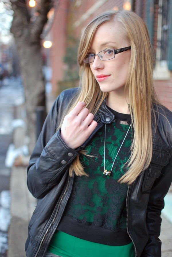 Miyan - love the green pop of colour under the sheer lacey black sweater. you look casual and comfy, but way cute! have fun in NY for the blogger conference, hope you post all about it!