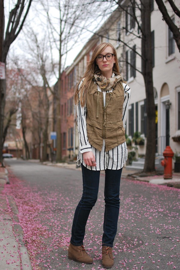 [blouse + vest: h&m / jeans: bdg / shoes: c/o 8020 / scarf: gifted / glasses: c/oĀ warby parker]