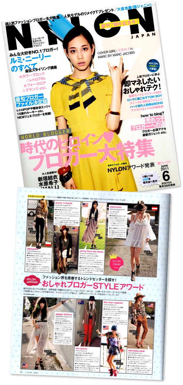Heeeyoooo! Super pumped to have been featured in the May 2011 issue of NYLON Japan. I mean what could be better featured next to the Man Repeller!?! Much love to the people over in Japan that have love for eat.sleep.wear. Now if only I could read Japanese… Kisses Japan <3