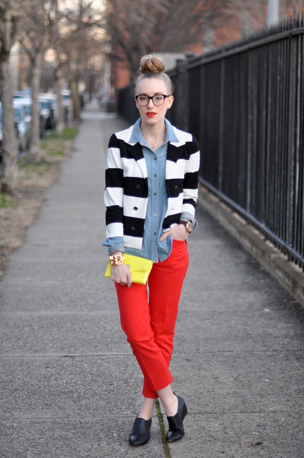 Nothing says Friday like a pair of bright red pants! I feel like red pants have been attracting themselves to me and I LIKE it. For this look I went more preppy and polished with my chambray shirt. To still give it a funky edge, I paired a striped blazer and some chunky wrist pieces to keep things fun. This particular day I was doing a lot of walking so I opted for these black wedges. Hope this adds a little color to your Friday.