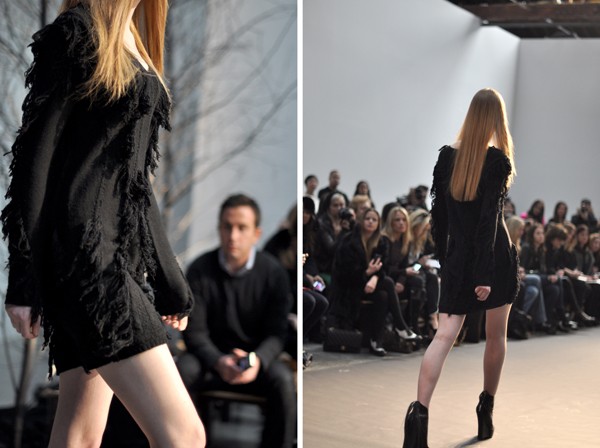 Kimberly Ovitz pieces were as dynamic coming as they were going. Dramatic asymmetrical cuts reigned supreme in this ultra modern collection. I loved the strong brow and minimun face makeup used on the models as well. Drama!