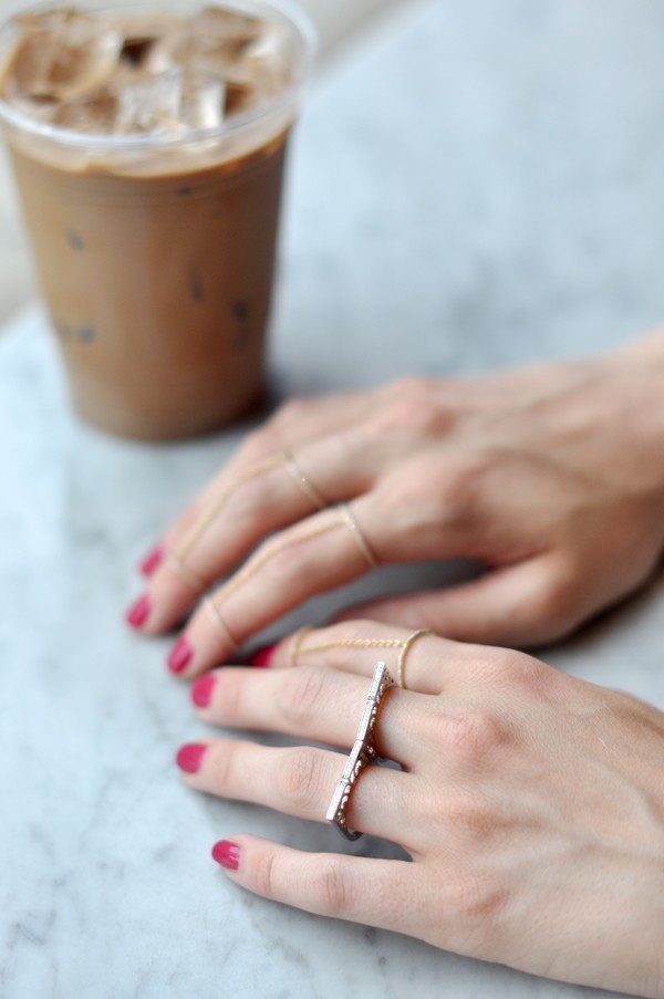 I am excited to share a collaboration I am doing with the people behind Plukka, the makers of beautiful jewels. I have always been an accessories girl so I was excited to try out some of their new pieces and take them along with me in my daily routines. I just moved to Brooklyn in the beginning of June for those that may not know, so I am still exploring my new neighborhood everyday. One of my favorite things to do when I have free time, is to go out and grab a cup of coffee and people watch. Lately my drink of choice is an iced mocha as a nice sweet afternoon treat! It was the perfect backdrop to share these delicate gold rings. I love that they are feminine but still have an edgy design. I didn’t want to take them off!!