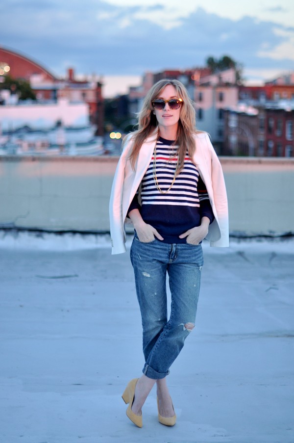 Let’s take a little quick break from NYFW to bring you a fun project with Quiksilver. It’s called the Traveling Sweater. Each person styles this sweater in their own way and it gets passed off! Christine was the first to kick it off here. As you know I have been loving my boyfriend jeans so I knew I had to wear them with my comfy sweater. I wanted to add a little bit of polish so I threw on a crisp blazer and fun colored wedges. To follow this sweaters journey and see who will style it up next, head HERE! Also stay tuned later today for some more NYFW updates.