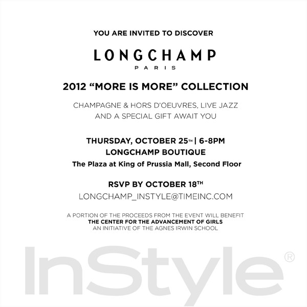 PA friends! I am so excited to be hosting an event at the King Of Prussia Mall close to my hometown next Thursday! Come join me at Longchamp for a night of cocktails, live jazz, treats and of course some shopping. All proceeds from the event will benefit The Center For The Advancement of Girls. Please RSVP to Longchamp_Instyle@timeinc.com and hope to see you there.