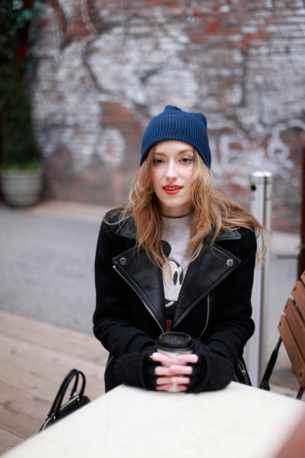 I feel like everyday lately I have thrown on a beanie and ran out the door. Second nature at this point. So the more hats the better. I also finally got to wear this mickey mouse sweater I scored. Kind of funny seeing as I have never been to Disney, but LOVE Disney. This sweater is a sign that I need to go meet the Disney princesses and have one of those amazing looking Mickey Mouse ice creams. I call this urban Mickey. Riding the line between G-rated and rock and roll. I like it.