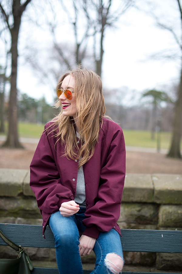 Weekends for me are all about some comfy basics and this weekend I took a trip down memory lane. Years ago I scored this old varsity jacket from my high school and my mom held onto it for me and unearthed it last month. Mom, this is gold. Just a little slice of Abington pride for my Sunday in Brooklyn. This look was all about a splash of color, no accessories, and some patterned flats for an impromptu picnic in the park.
