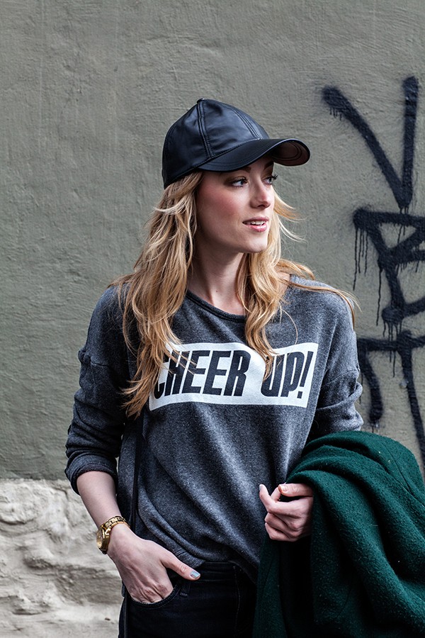 [jacket: topshop / sweater: zara / pants: ag jeans / shoes: nike / hat: asos / bag: marc by marc jacobs]