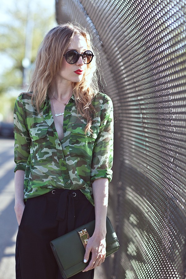 [top: equipment / pants: french connection / shoes: sigerson morrison / shades: marc by marc jacobs