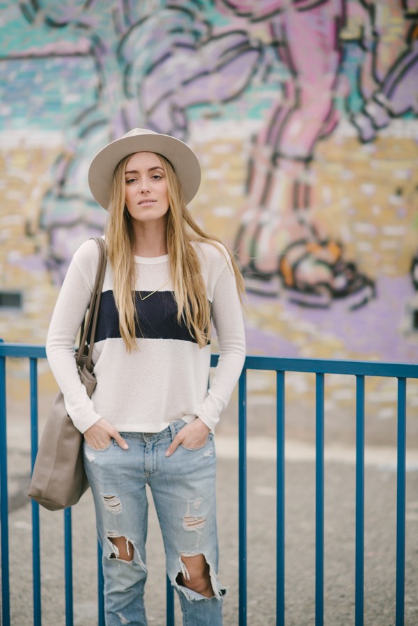 My weakness for ripped denim continues… Sorry mom! Ironically I wore these out for a day of showing my parents around Venice Beach. It was a gloomy, but what day is bad at the beach? Love a little overcast sky and quiet vibe in a usually crowded place. Easing into Spring, light weight sweaters are key. Love the graphic stripe on this one. Keeping my looks simple with a punch. Also, when did my hair get this long?! I think I need a trim…