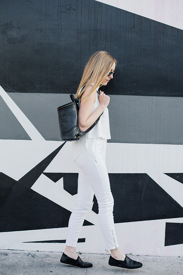 Look 1 / top: elizabeth & james / jeans: j.brand / backpack: c/o frye / shoes: c/o frye / shades: ray-ban