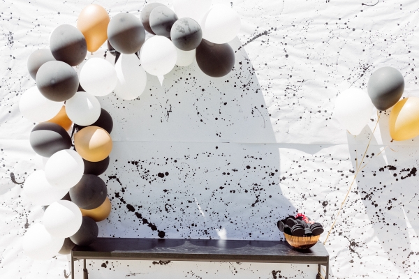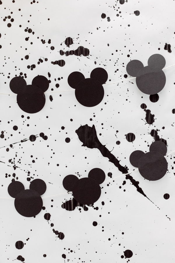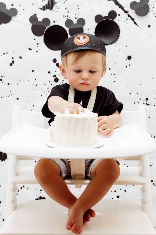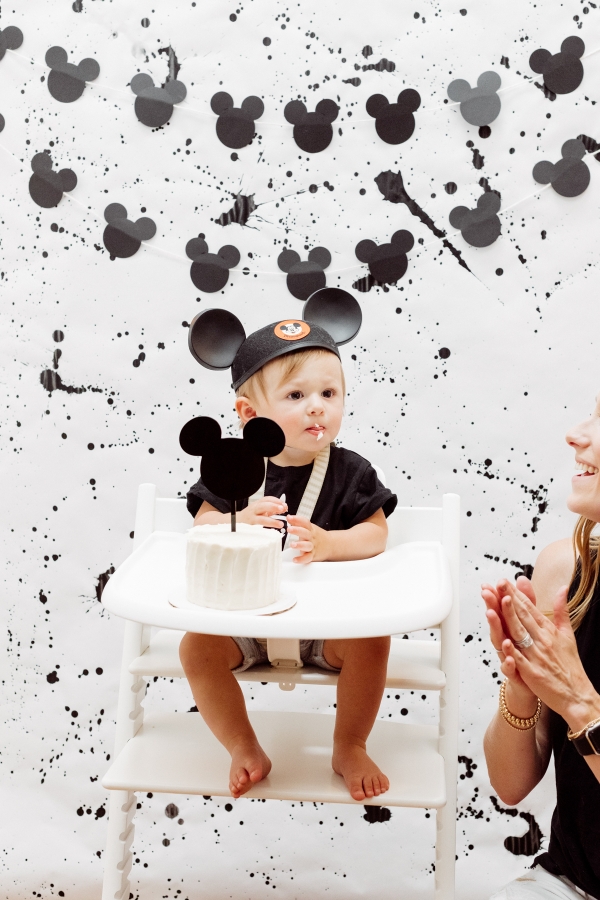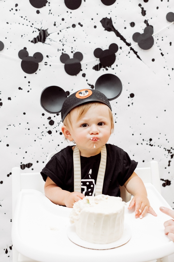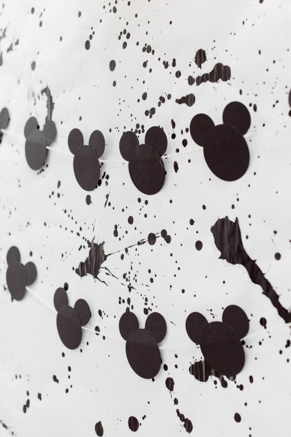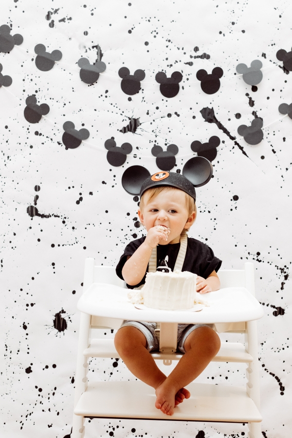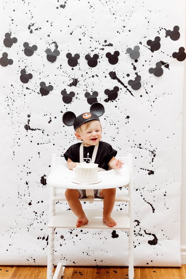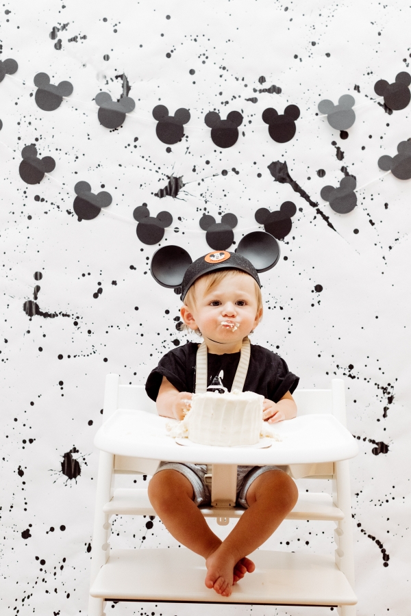 For the cake smash area, I wanted to create a custom backdrop for his special moment. I also searched the internet for paint splattered photo backdrops but could not find what I needed so decided to make it myself with some black acrylic paint. It ended up being pretty easy and really turned out great if I say so myself. I also hung some of the homemade Mickey garland there.