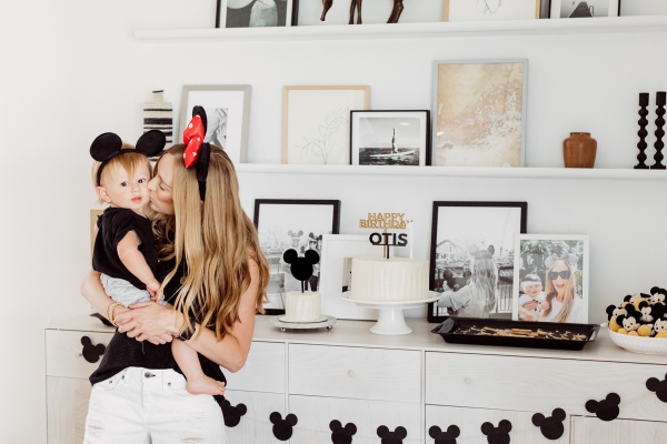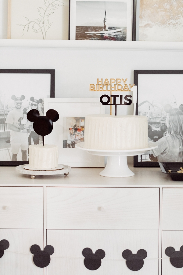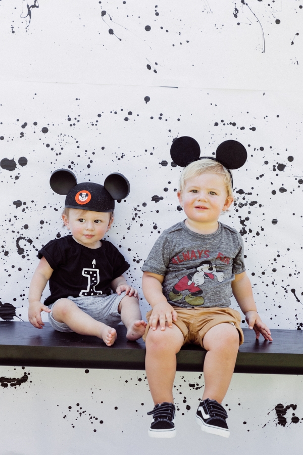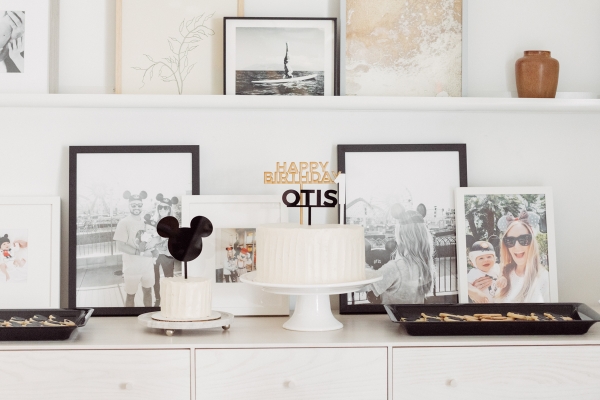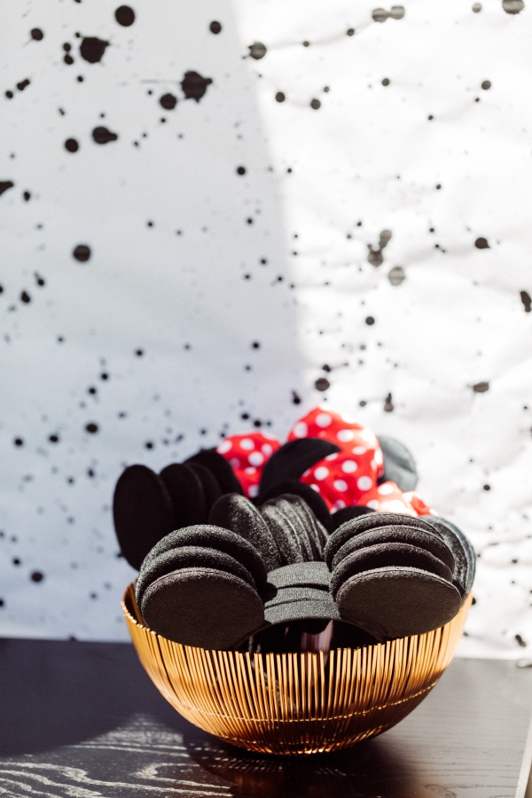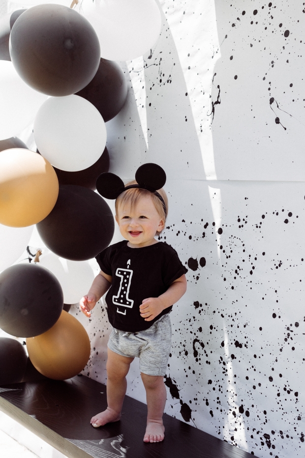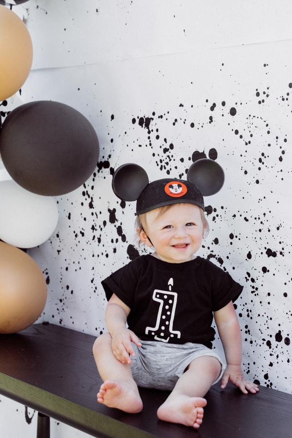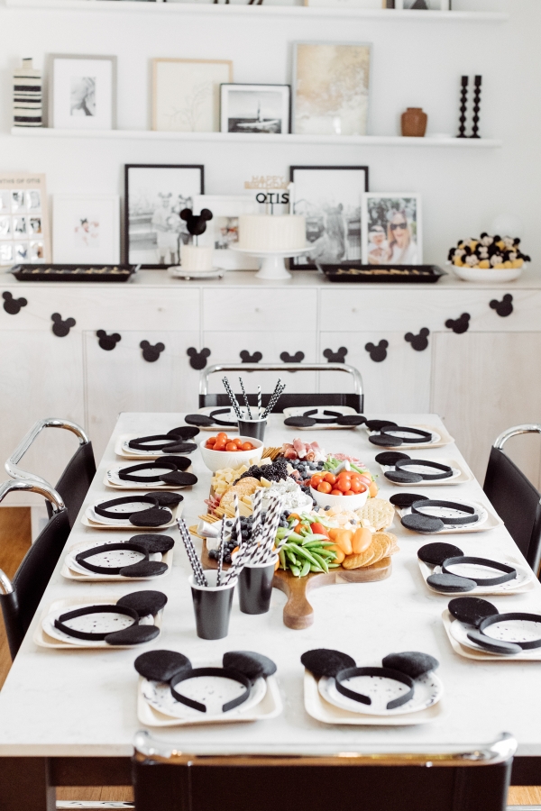 For Otis’ party, we decided on Mickey Mouse! We have been going to Disneyland since Otis was 2 months old and on our last trip, he saw Mickey Mouse and started pointing and wanted to run to him. It’s clear he loves Mickey! I didn’t want the typical red and yellow accents for the party.. Instead, I wanted to give the Mickey Theme a modern twist and keep things mostly black and white with a pop of gold. I found this plate and pretty much fell in love with the splatter pattern and decided to base the whole party around it. For the tablescape, I found this giant wood cutting board to use as a cheese board so I could fit cheese, veggis and fruits for the whole crowd of 40 people. We kept the other food simple by ordering pizzas and grilling hot dogs. I set the place settings for the kids and included Mickey Mouse ears as a fun decor accent that the kids could wear for the party.