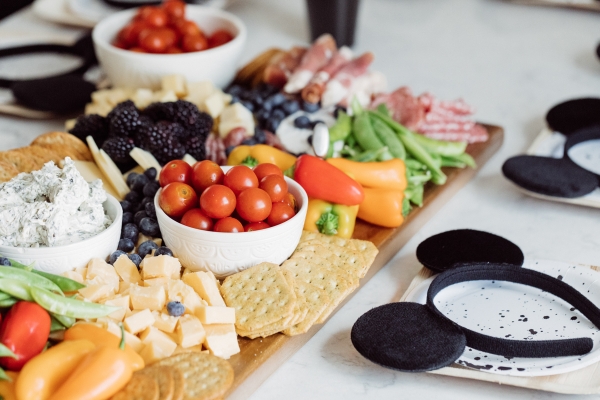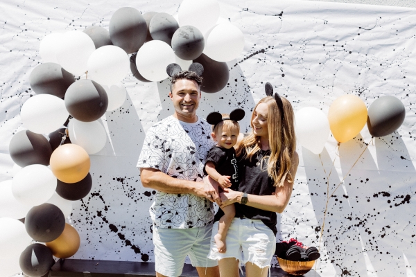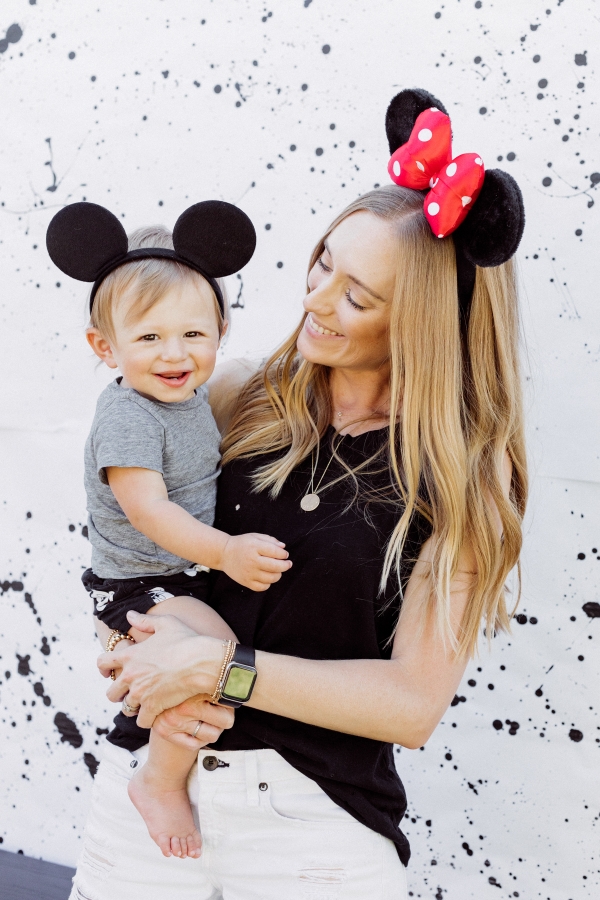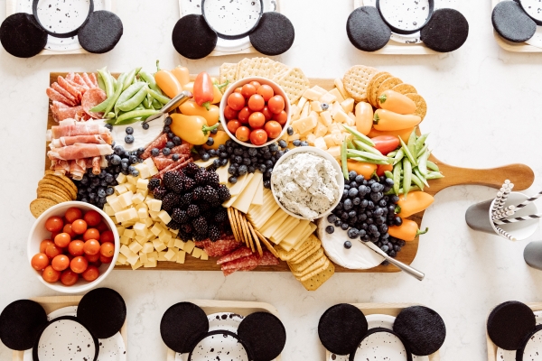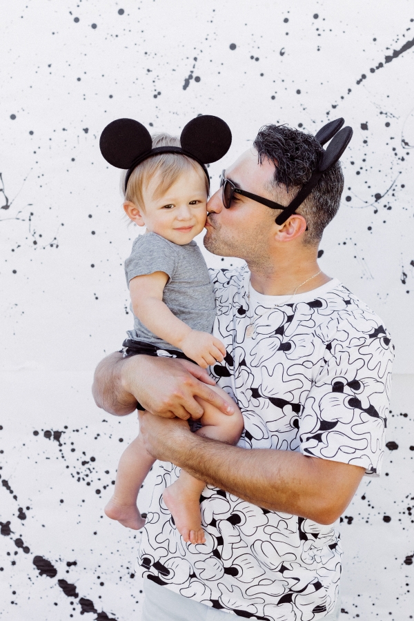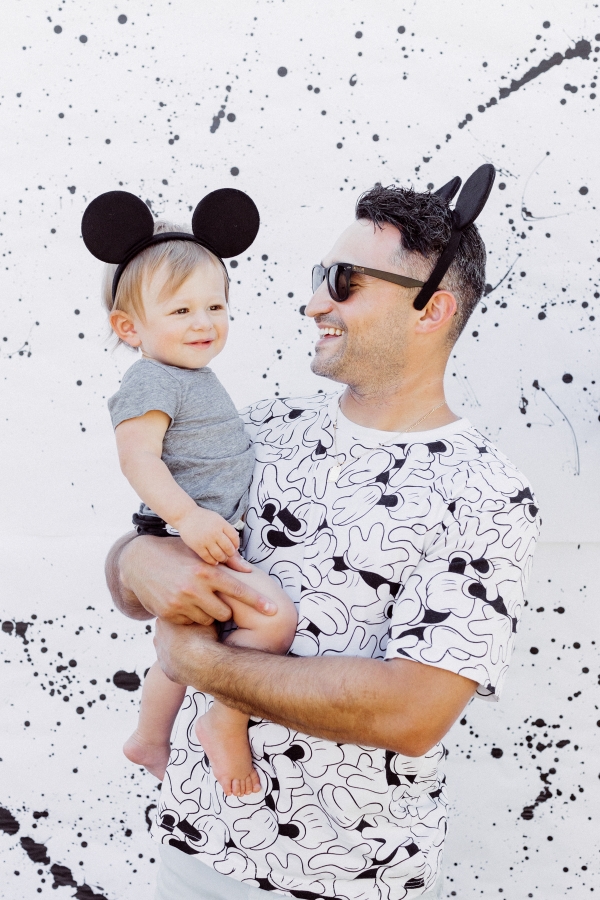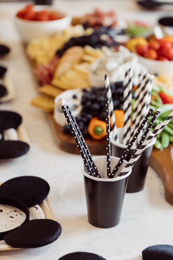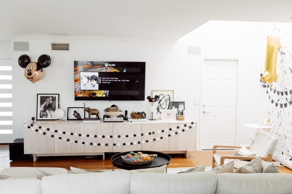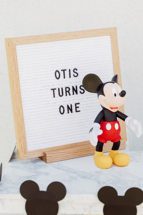 For Otis’ party, we decided on Mickey Mouse! We have been going to Disneyland since Otis was 2 months old and on our last trip, he saw Mickey Mouse and started pointing and wanted to run to him. It’s clear he loves Mickey! I didn’t want the typical red and yellow accents for the party.. Instead, I wanted to give the Mickey Theme a modern twist and keep things mostly black and white with a pop of gold. I found this plate and pretty much fell in love with the splatter pattern and decided to base the whole party around it. For the tablescape, I found this giant wood cutting board to use as a cheese board so I could fit cheese, veggis and fruits for the whole crowd of 40 people. We kept the other food simple by ordering pizzas and grilling hot dogs. I set the place settings for the kids and included Mickey Mouse ears as a fun decor accent that the kids could wear for the party.