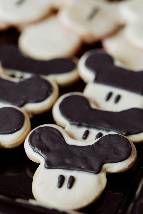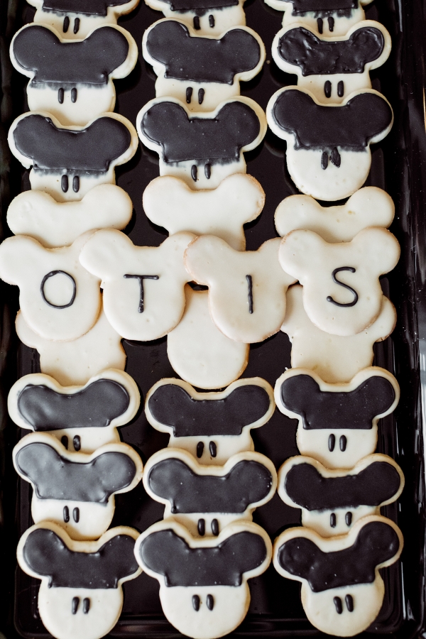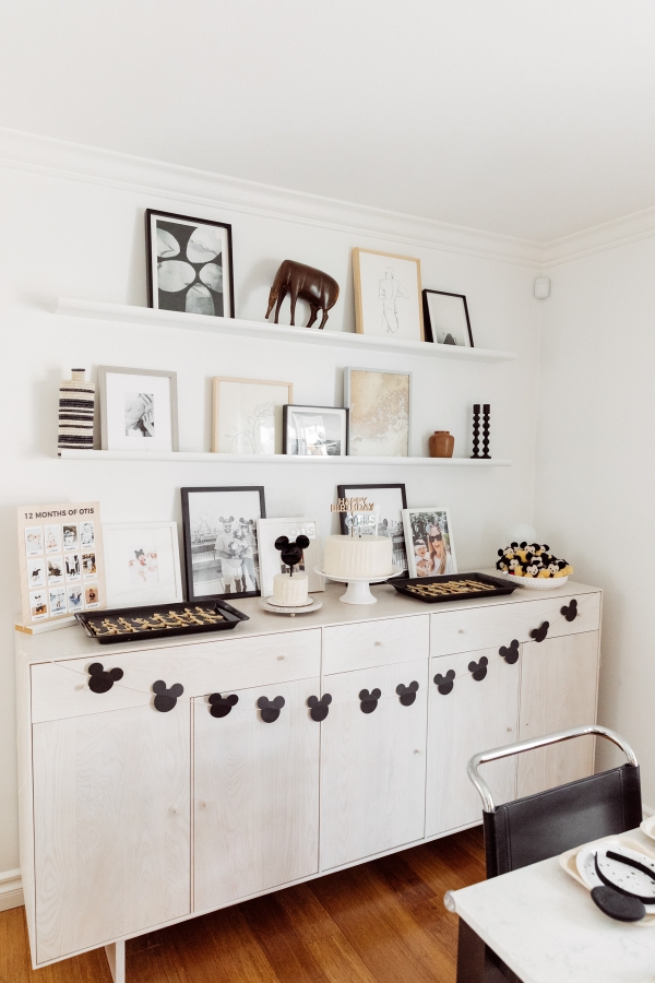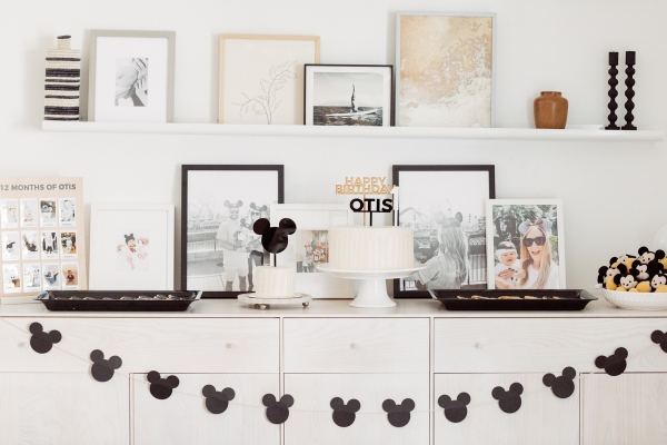 For the dessert table, I set this up on my dining room cabinets to keep it out of the way and also double as a decor moment. I had the cake toppers custom made along with the 12 Months of Otis sign which quickly gave our simple white cakes the finishing touch they needed. An idea I had to tie in my existing decor style with the party theme was to have some photos of Otis at Disneyland framed from framebridge. Having those photo memories be part of our day was so special and fun to include some photos of Otis when he was younger. I also got these tiny Mickey Mouse plush toys for the kids as party favors and they served as a decor element during the party which was fun and playful. For the sugar cookies, I actually made them myself! It took me 3 days to complete them but they turned out so cute. I used this recipe. The last element of this space was the homemade Mickey Mouse garland. I spent time searching the internet for plain black garland and there was nothing that was speaking to me, so I decided to make my own with the help of my amazing friends.