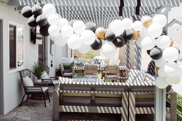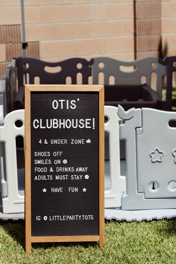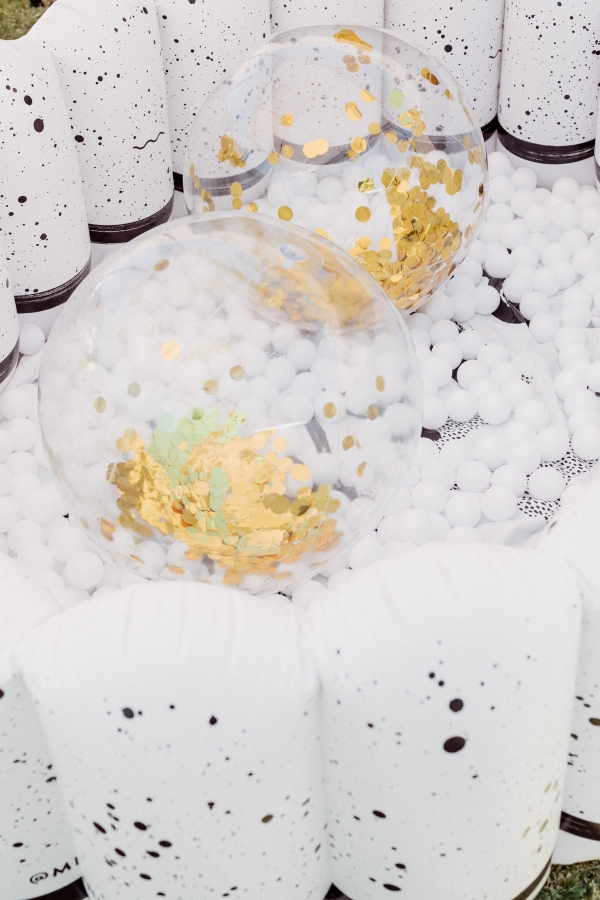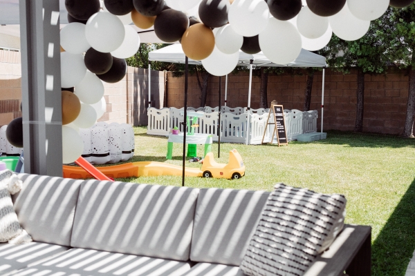 We created a photobooth on the side of our house and made balloon arches with packets I purchased on Amazon. Oh man… these balloons came with some drama (one burst the night before a shattered a wine class all over my bedroom) but they were shockingly pretty easy to make. Just very time consuming. The only problem we had was that the day of the party was very hot so the balloons deflated pretty quickly and were popping somewhat. So they didn’t look their absolute best but they still added a nice accent to the party. Another fun activity we had at the party was a soft play space from Little Party Tots. They basically came and set up foam tiles with a bunch of foam toys and a foam ball pit and then gated the area to create a safe and fun playspace for kids under 3. GENIUS idea. Otis spent most of the party playing there. Such a great idea if you have young babies and kids. I also set up my own inflatable pool from minnidip and got some ball pit balls on amazon for the bigger kids to have their own ball pit fun. FYI for anyone wanting to fill a pool with ball pit balls… this was 800 and not nearly enough to look full. But I tried. HA.