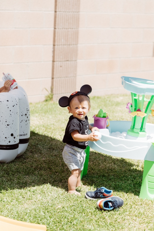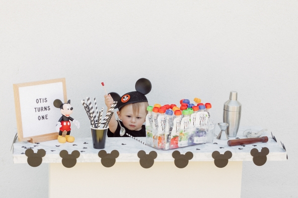 Another special little area outside was the mini bar. Or should I say Minnie bar?? Are you laughing? Mom jokes. My friend Ashley actually had her husband build this for her daughter’s first birthday party and she kindly let me borrow it. I customized it to match our theme by adding my homemade garland and homemade Mickey confetti. I included some of Otis’ favorite cold pressed pouches from Once Upon a Farm for the kids. They were a big hit and nearly all of them were gone at the end of the party! We also placed some typical bar items up there and Otis grabbed the spoon and wouldn’t let go. By far the cutest and funniest photo of our sweet little bartender.
