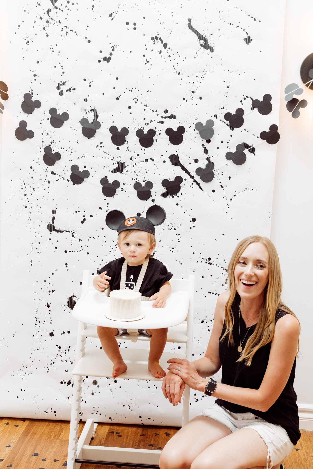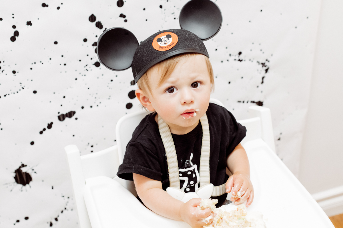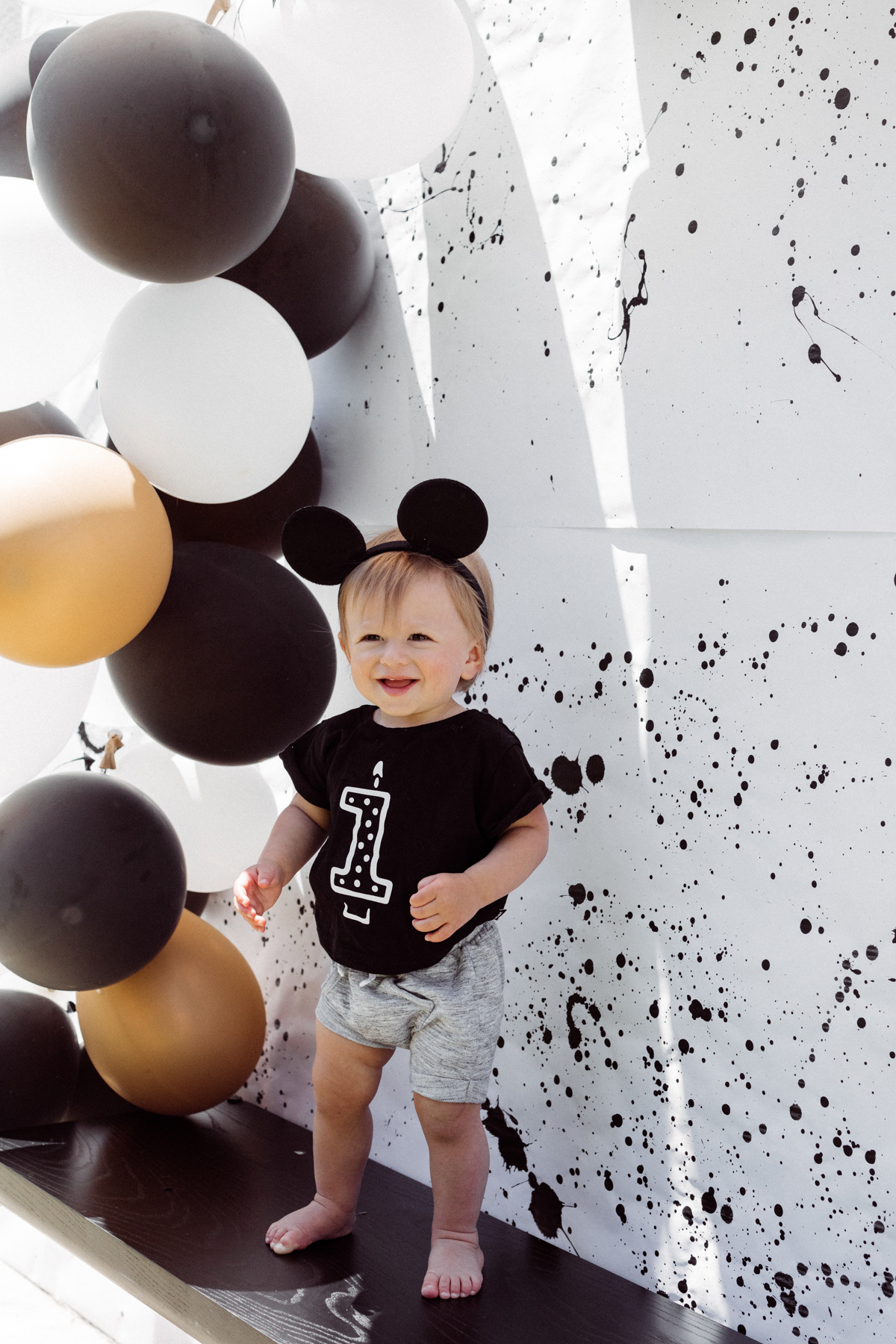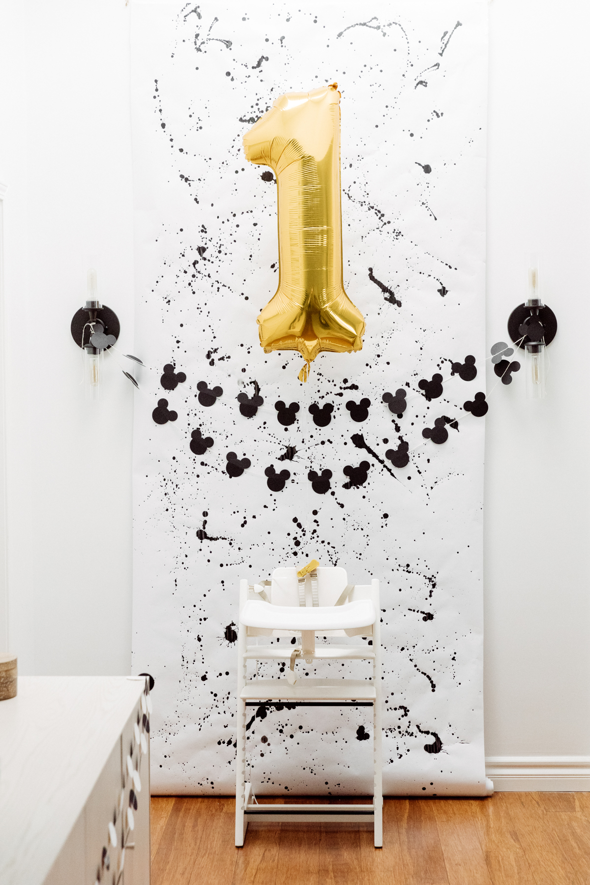 For the cake smash area, I wanted to create a custom backdrop for his special moment. I also searched the internet for paint splattered photo backdrops but could not find what I needed so decided to make it myself with some black acrylic paint. It ended up being pretty easy and really turned out great if I say so myself. I also hung some of the homemade Mickey garland there.