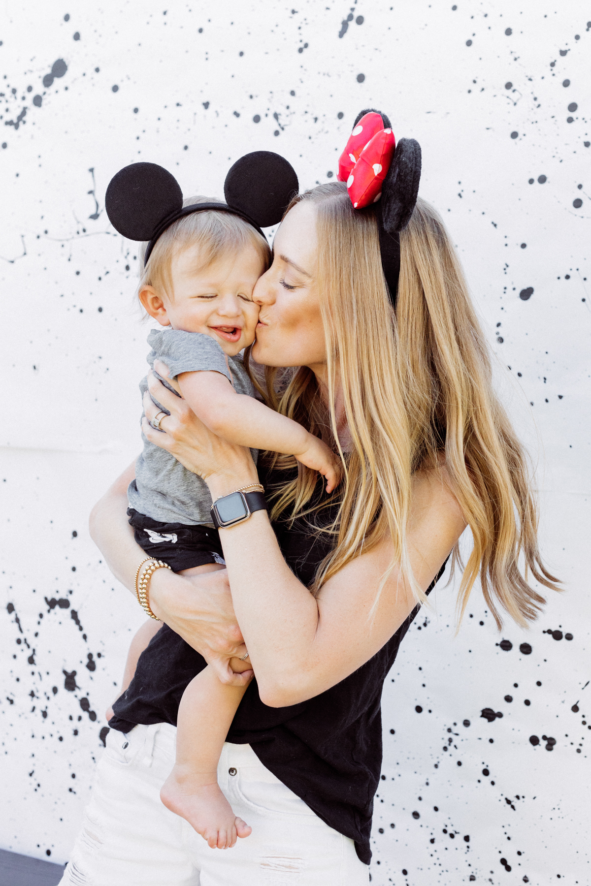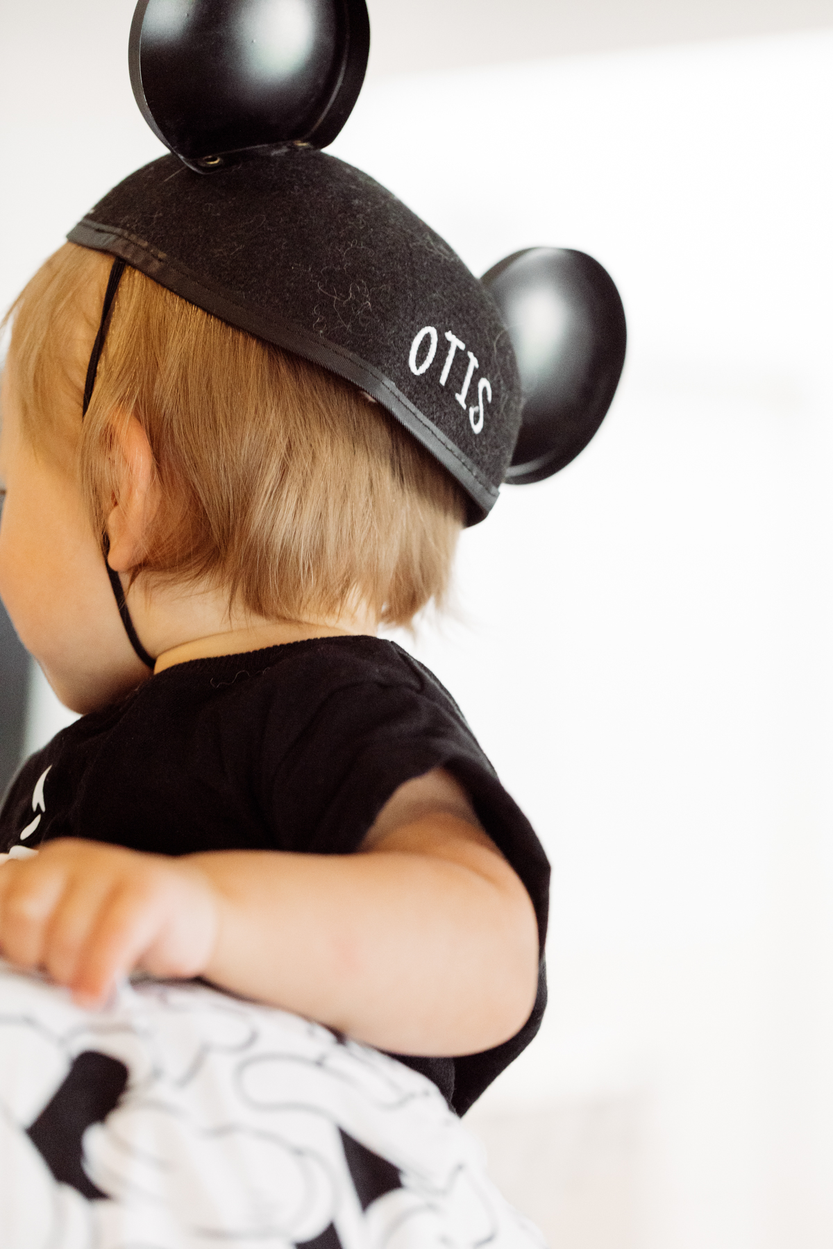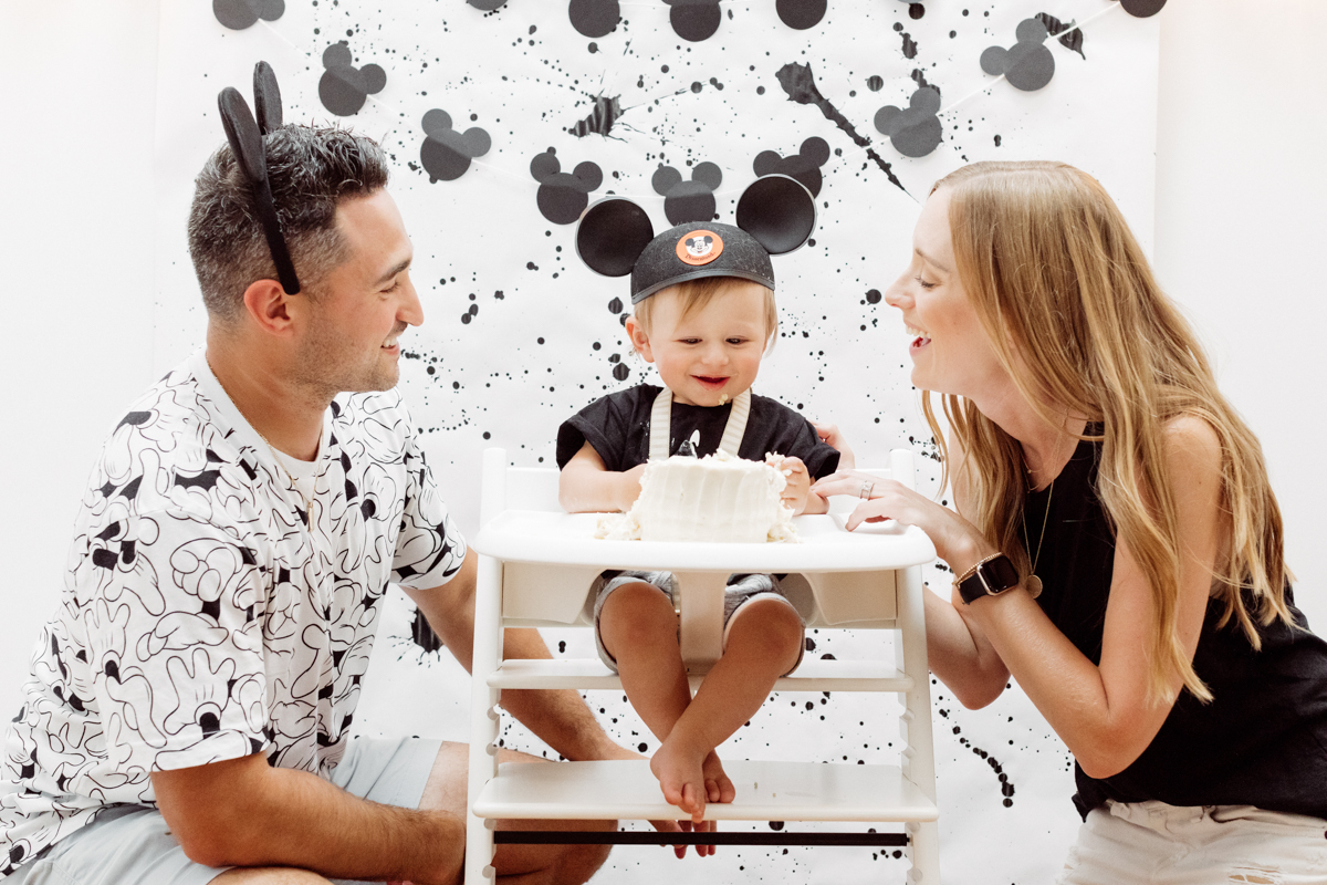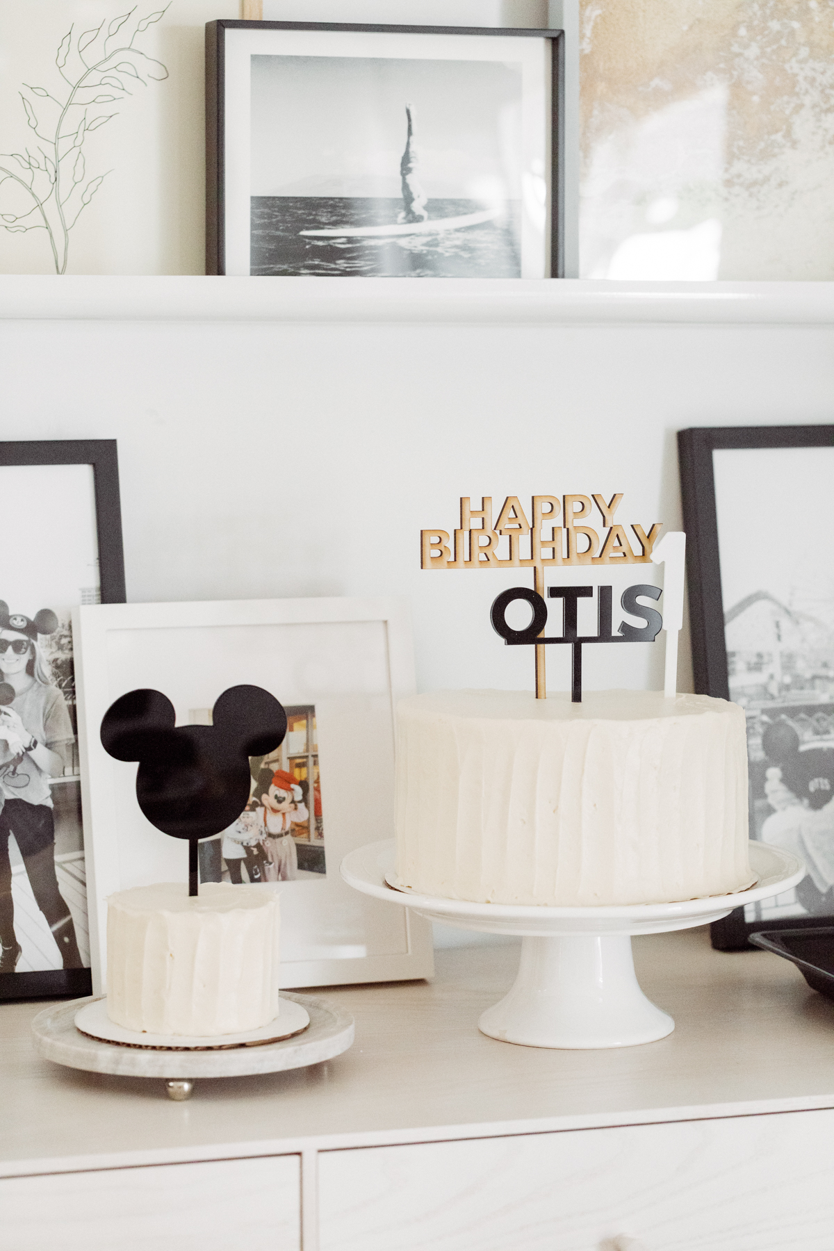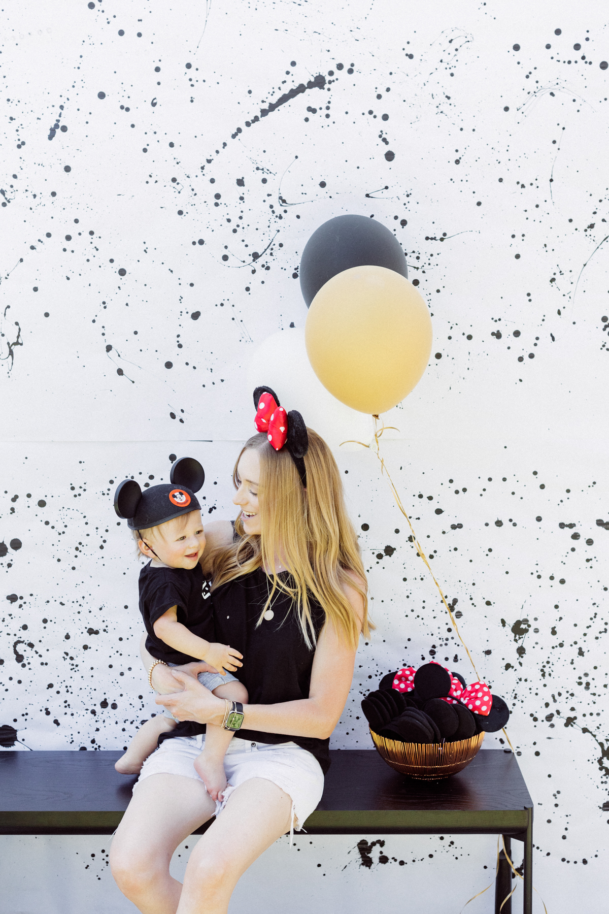 For Otis’ party, we decided on Mickey Mouse! We have been going to Disneyland since Otis was 2 months old and on our last trip, he saw Mickey Mouse and started pointing and wanted to run to him. It’s clear he loves Mickey! I didn’t want the typical red and yellow accents for the party.. Instead, I wanted to give the Mickey Theme a modern twist and keep things mostly black and white with a pop of gold. I found this plate and pretty much fell in love with the splatter pattern and decided to base the whole party around it. For the tablescape, I found this giant wood cutting board to use as a cheese board so I could fit cheese, veggis and fruits for the whole crowd of 40 people. We kept the other food simple by ordering pizzas and grilling hot dogs. I set the place settings for the kids and included Mickey Mouse ears as a fun decor accent that the kids could wear for the party.