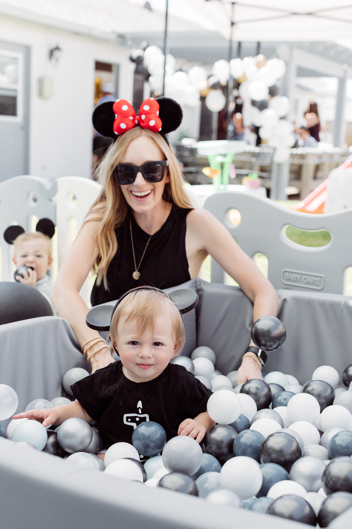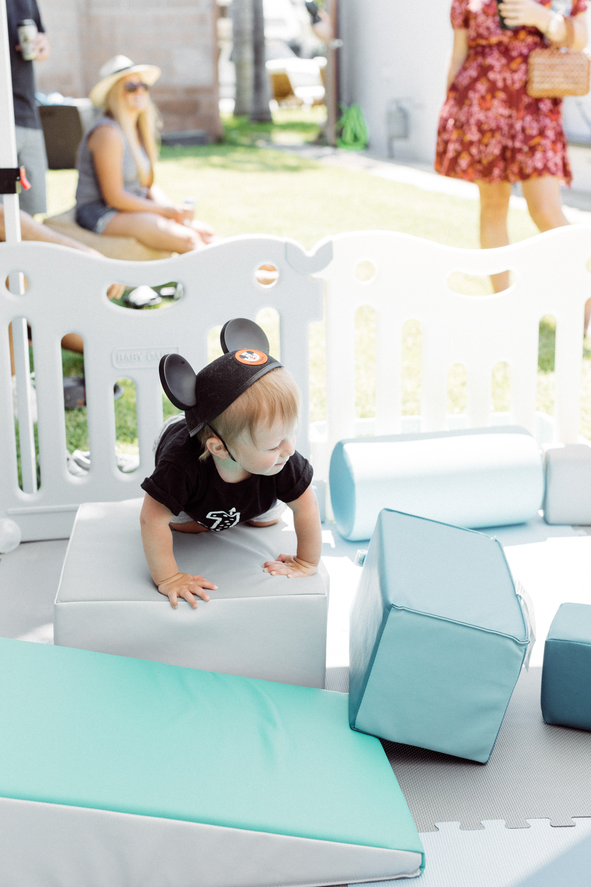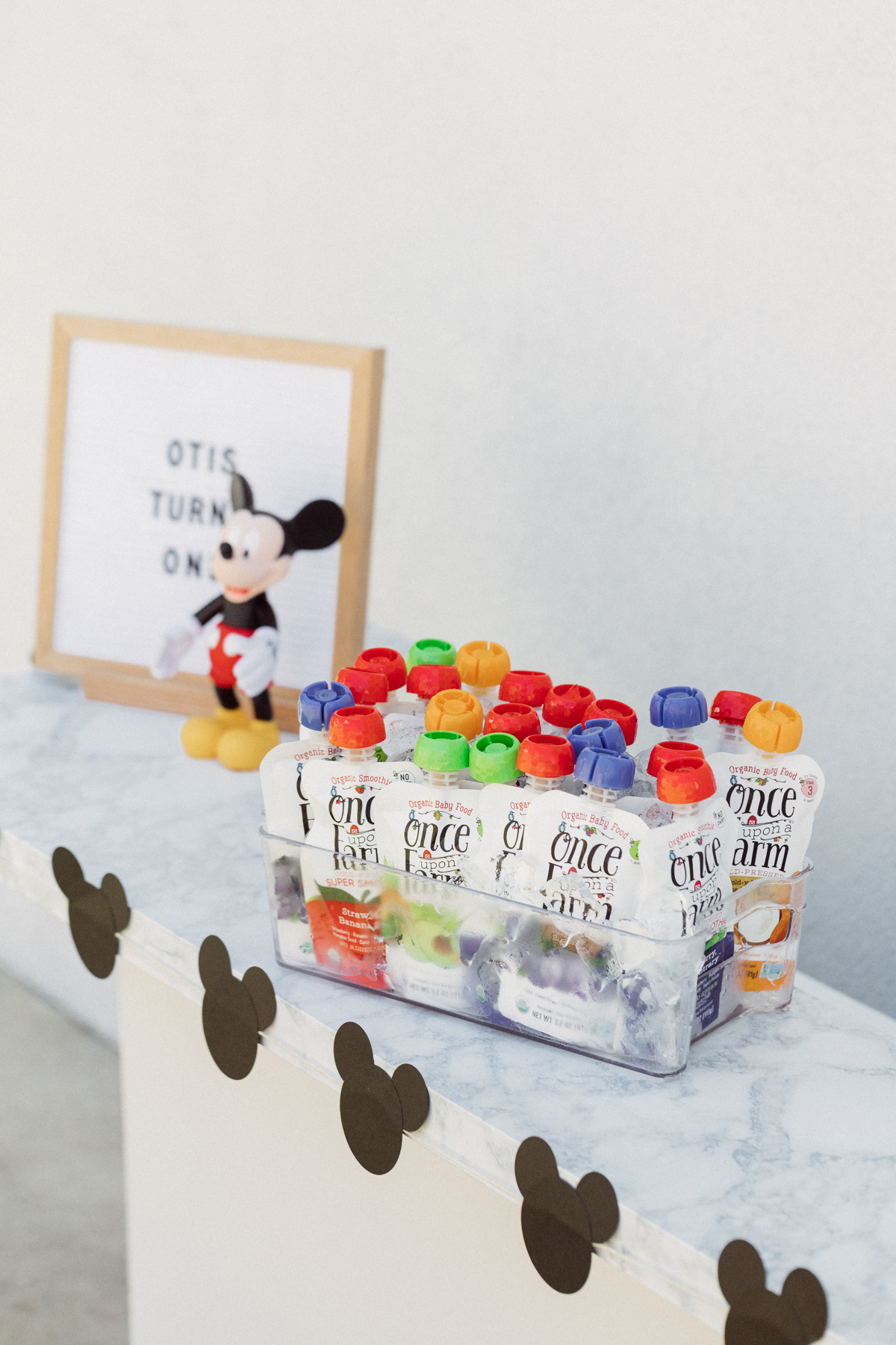 Another special little area outside was the mini bar. Or should I say Minnie bar?? Are you laughing? Mom jokes. My friend Ashley actually had her husband build this for her daughter’s first birthday party and she kindly let me borrow it. I customized it to match our theme by adding my homemade garland and homemade Mickey confetti. I included some of Otis’ favorite cold pressed pouches from Once Upon a Farm for the kids. They were a big hit and nearly all of them were gone at the end of the party! We also placed some typical bar items up there and Otis grabbed the spoon and wouldn’t let go. By far the cutest and funniest photo of our sweet little bartender.