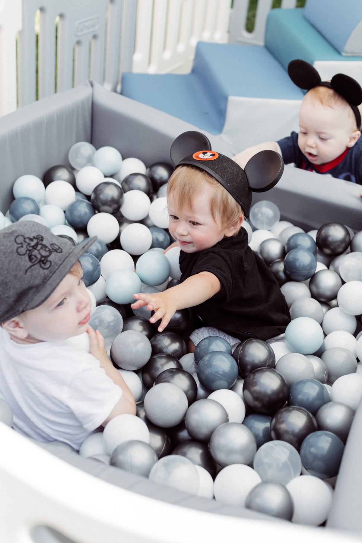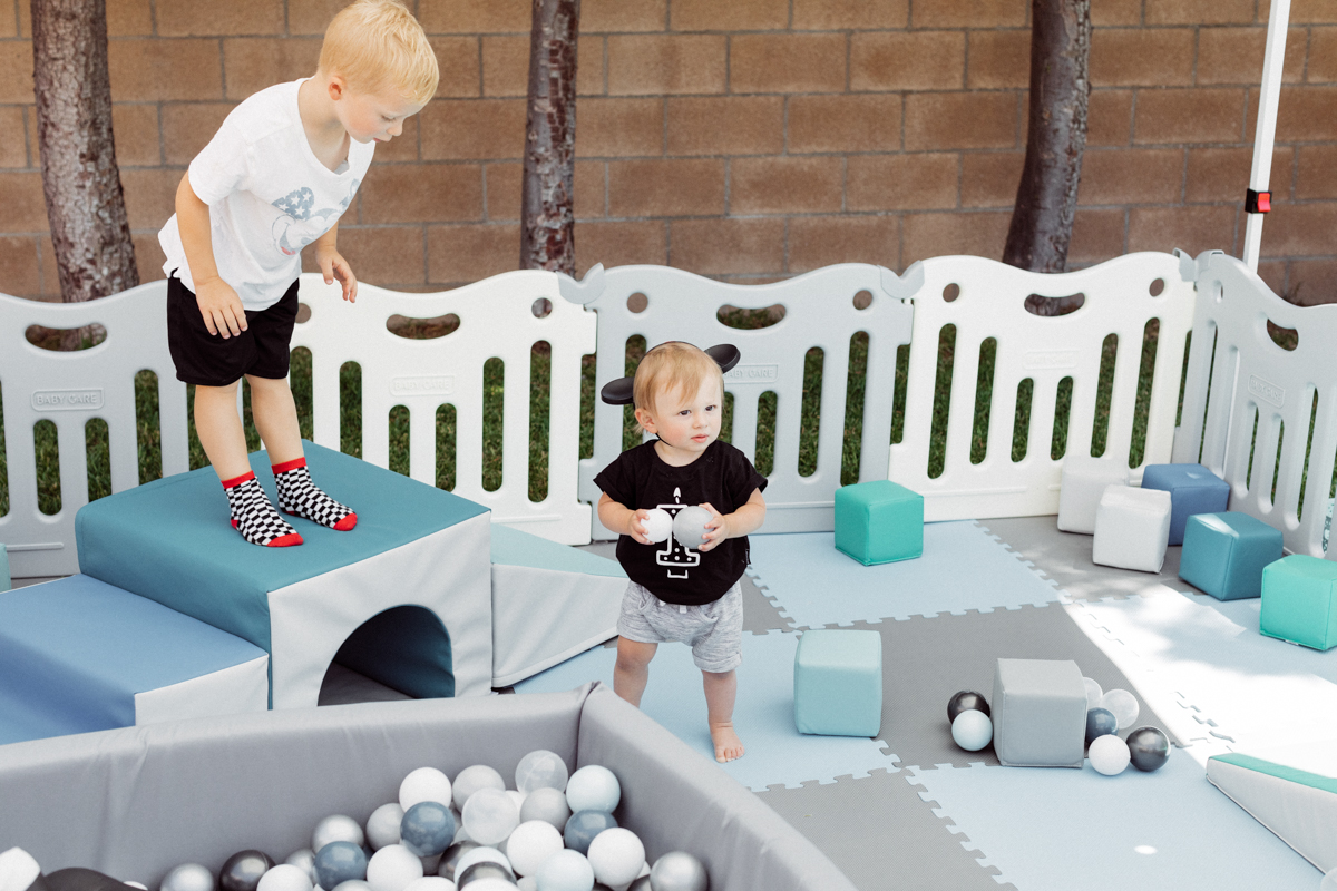 We created a photobooth on the side of our house and made balloon arches with packets I purchased on Amazon. Oh man… these balloons came with some drama (one burst the night before a shattered a wine class all over my bedroom) but they were shockingly pretty easy to make. Just very time consuming. The only problem we had was that the day of the party was very hot so the balloons deflated pretty quickly and were popping somewhat. So they didn’t look their absolute best but they still added a nice accent to the party. Another fun activity we had at the party was a soft play space from Little Party Tots. They basically came and set up foam tiles with a bunch of foam toys and a foam ball pit and then gated the area to create a safe and fun playspace for kids under 3. GENIUS idea. Otis spent most of the party playing there. Such a great idea if you have young babies and kids. I also set up my own inflatable pool from minnidip and got some ball pit balls on amazon for the bigger kids to have their own ball pit fun. FYI for anyone wanting to fill a pool with ball pit balls… this was 800 and not nearly enough to look full. But I tried. HA.