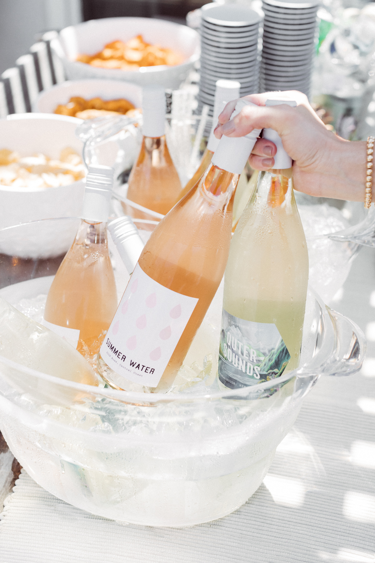 For beverages and food, I set up the outside table with a few ice buckets. I scored these awesome acrylic ones at homegoods. Blake picked out some beer and we also served rose and sav blanc from Winc (because that rose is my favorite) and mama deserved a drink after all this party planning. We also placed some chip bowls around this table because easy munchies are always tasty to have at party.