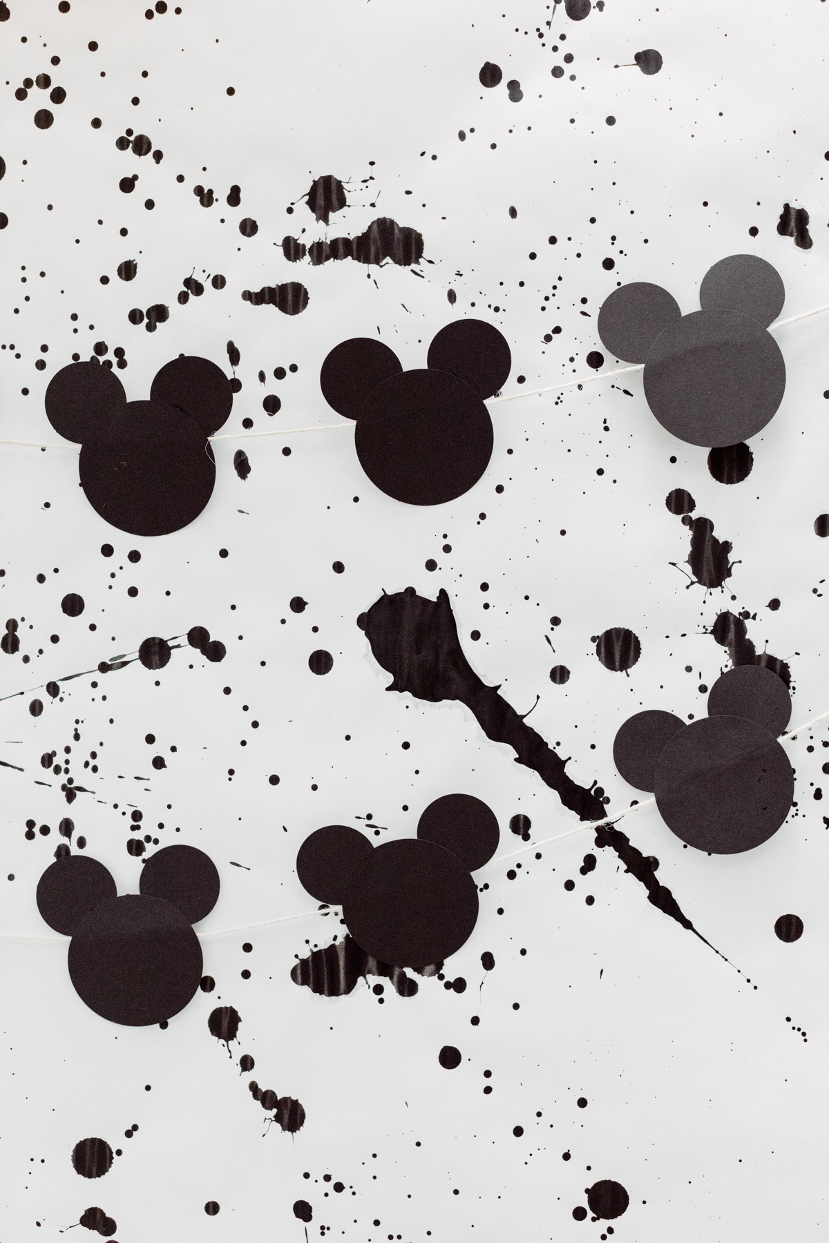 For the dessert table, I set this up on my dining room cabinets to keep it out of the way and also double as a decor moment. I had the cake toppers custom made along with the 12 Months of Otis sign which quickly gave our simple white cakes the finishing touch they needed. An idea I had to tie in my existing decor style with the party theme was to have some photos of Otis at Disneyland framed from framebridge. Having those photo memories be part of our day was so special and fun to include some photos of Otis when he was younger. I also got these tiny Mickey Mouse plush toys for the kids as party favors and they served as a decor element during the party which was fun and playful. For the sugar cookies, I actually made them myself! It took me 3 days to complete them but they turned out so cute. I used this recipe. The last element of this space was the homemade Mickey Mouse garland. I spent time searching the internet for plain black garland and there was nothing that was speaking to me, so I decided to make my own with the help of my amazing friends.