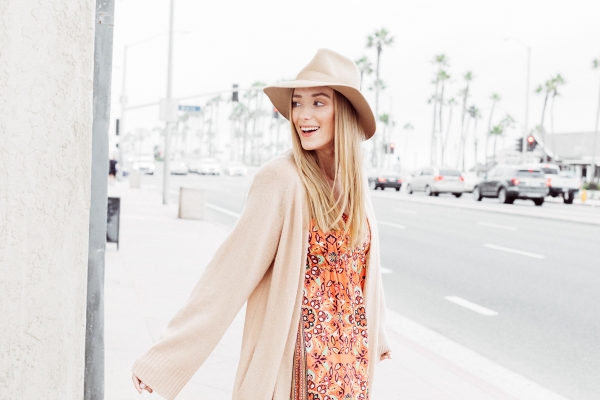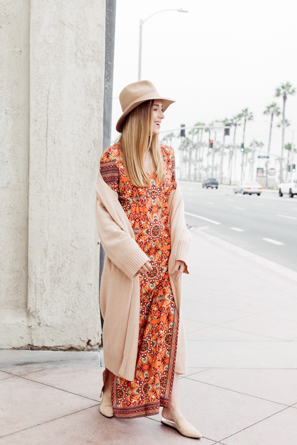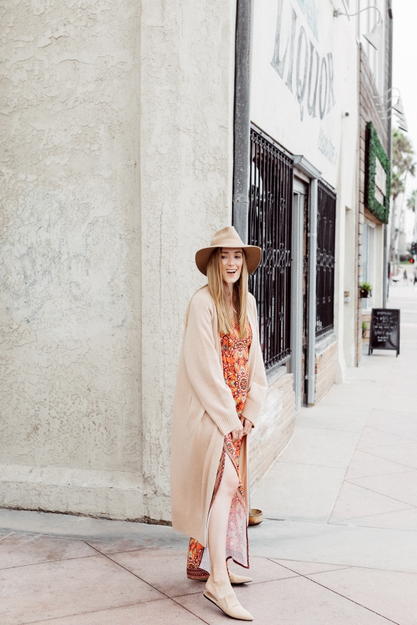 I still have so many Summery dresses to wear and love mixing them with knits to make them more fall appropriate. I don’t alway wear bright colors but I love that the sweater and hat give the look a neutral base. I secretly love these foggy mornings that have a chill in the air. Also, this sweater is a few seasons old but always such a staple in my closet. Cashmere is one of those pieces in your closet that will always be a good investment.