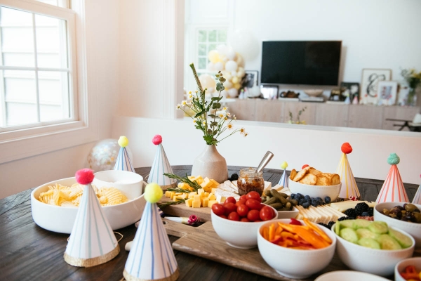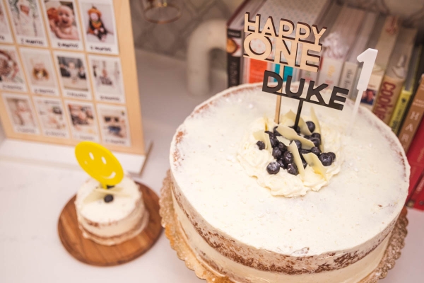 We ordered bbq and I made a cheese and veggie board to munch on. I was originally going to make the cakes but I ran out of time and decided to order them from a local bakery. Luckily, I talked to the sweetest lady who mixed some blueberries into the vanilla batter because Duke LOVES blueberries.