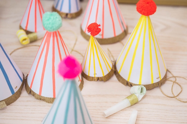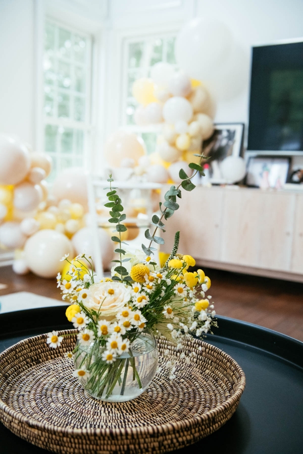 Balloons Arch kits: Popfestco Color Banana Cream Collection in Luxury size for behind highchair and Petite Size on stairs // Smiley Face Balloons: amazon // happy birthday banner, mini party hats, large party hats, blowers, confetti balloons, stripe napkins, yellow napkins, stripe yellow plates, yellow cups: meri meri party
