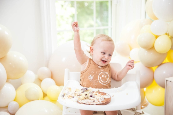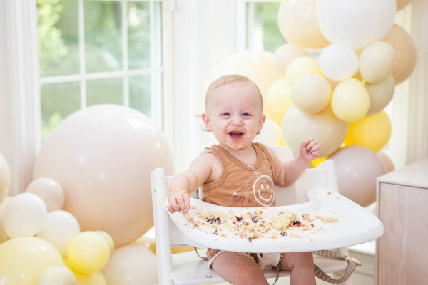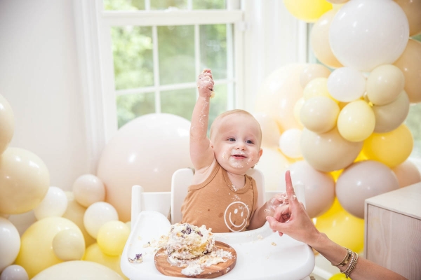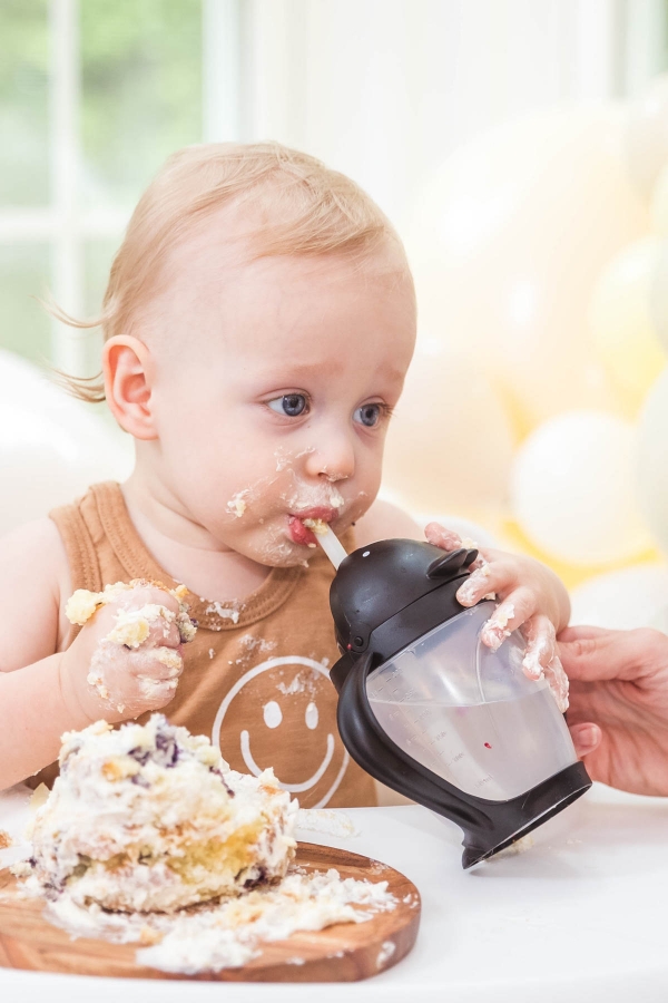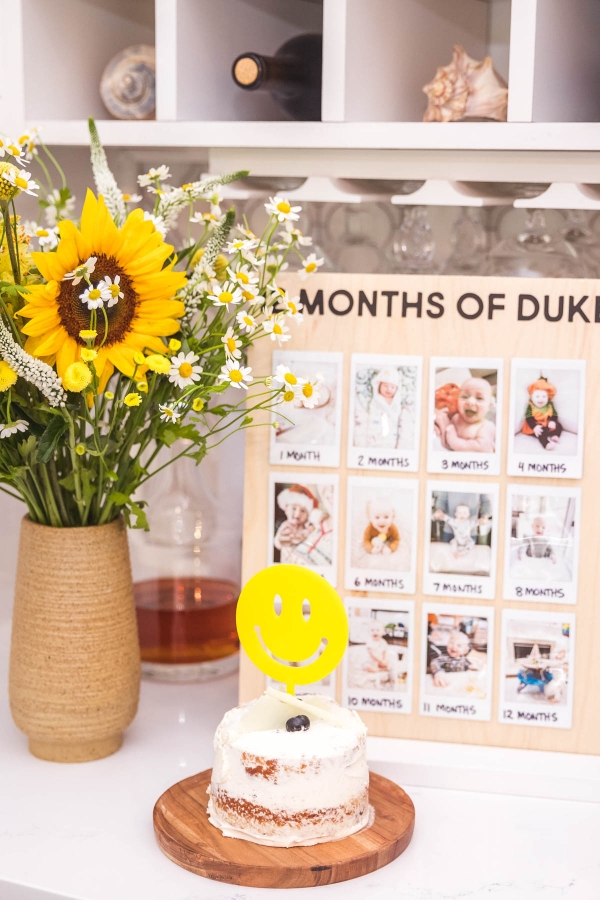 Cake: Alice Bakery and Confectionary // cake toppers word: poppy jack shop // cake topper smiley face: poppy jack shop (I had these custom made) // platters for cakes: homegoods // 12 months sign + stand: poppy jack shop // flowers: I arranged a mix from trader joes in a CB2 vase // highchair: stokke tripp trapp // cup: lollaland