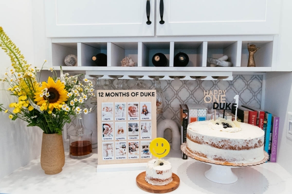 We got the chance to celebrate sweet Duke’s first birthday party a few weeks ago. The 1st Birthday party is such a milestone for us to celebrate our year with our miracle baby. If you are new here, you can read about our lengthy IVF journey to get to both Otis and Duke so this first birthday is another one to celebrate. Something really special about this party is that it was the first birthday party for our kids in our new home, surrounded by our families. Our families have previously not been there for birthdays because we lived so far so that made this one that much more magical.