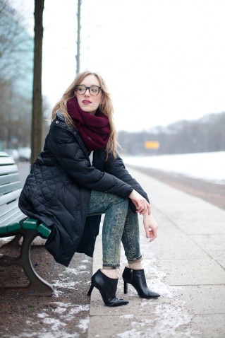 [jacket: kenneth cole (simliar) / scarf: zara / sweater: zara / pants: true religion / booties: hugoboss / glasses: warby parker / lipstick: nars scarlett empress] I am currently up in the air traveling back to NYC from California….